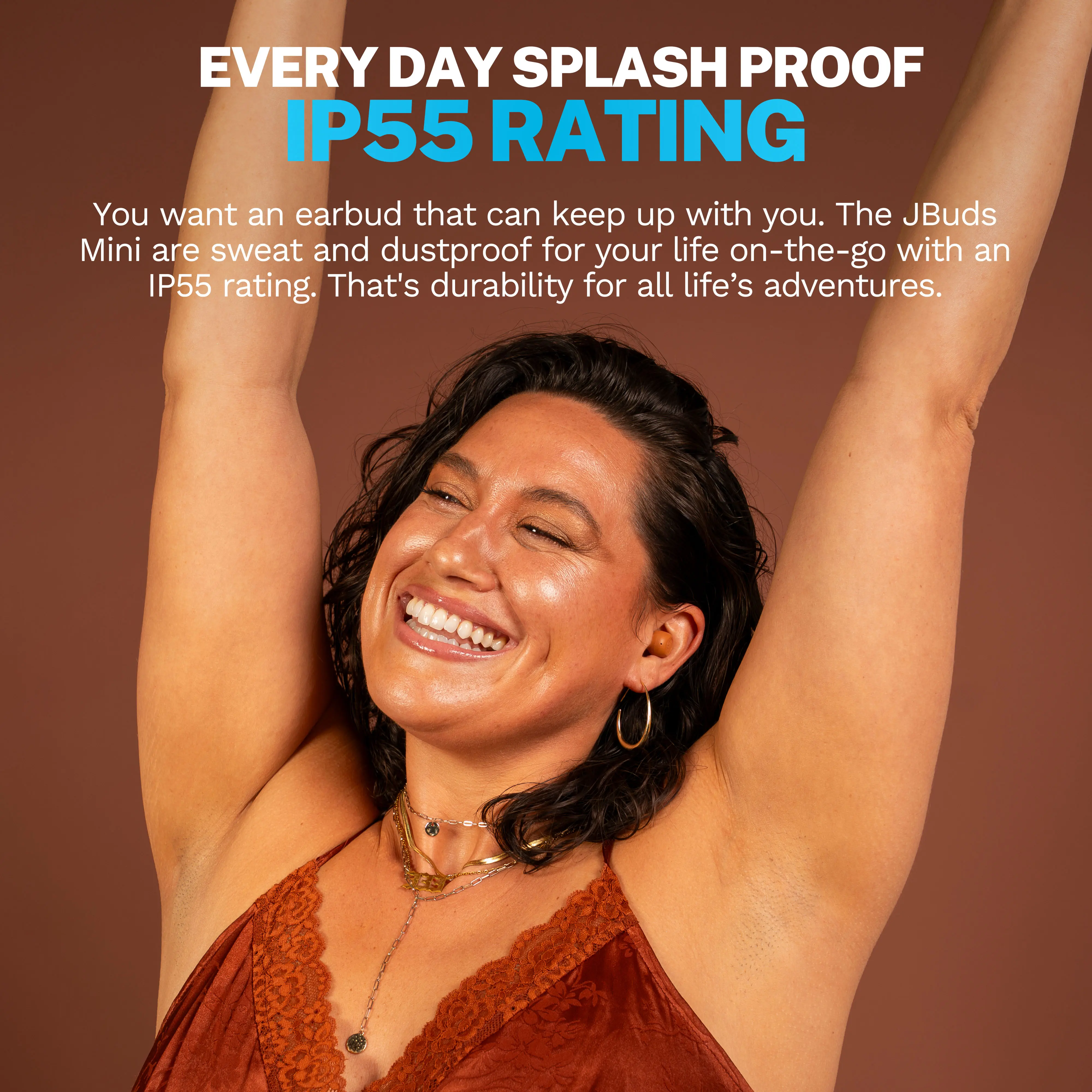 Everyday proof IP55: You want an earbud that can keep up with you. The JBuds Mini Tones are sweat and dustproof for your life on-the-go with an IP55 rating. That's durability for all life’s adventures.