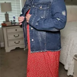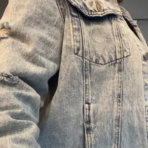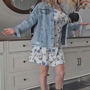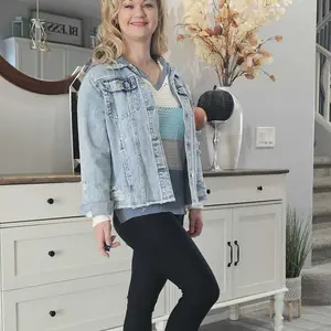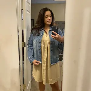 I love this jacket!! The distressing and the frayed bottom is so nicely done! It’s so soft, not stiff like other jackets. It’s oversized so I sized down. You won’t regret this purchase.