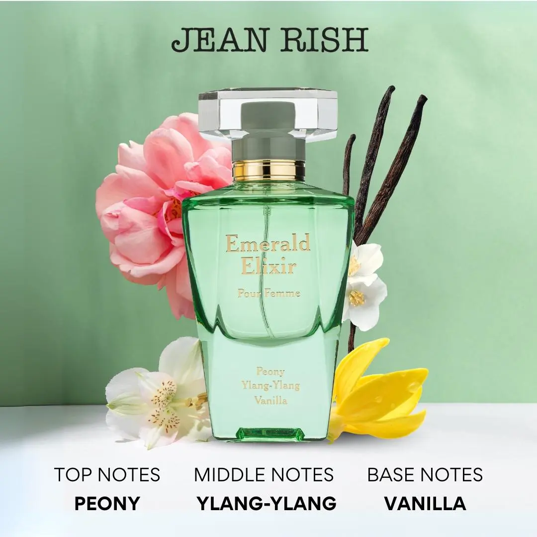·EMERALD ELIXIR - blends bright Peony and exotic Ylang Ylang with a soft Vanilla heart, resting on a warm base of Vanilla and Sandalwood. Housed in a sleek 3.4 Fl Oz / 100ml bottle, it’s a floral-sweet scent full of elegance and allure.