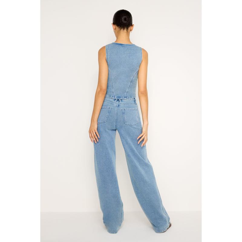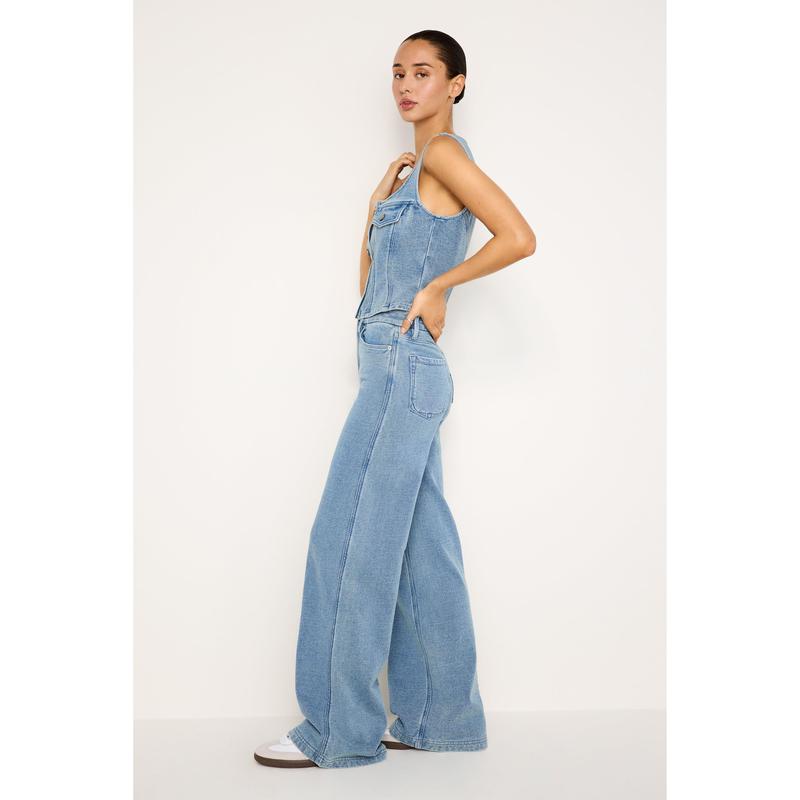 High-riseRelaxed wide legsFunctional pocketsSuper stretchClassic 5-pocketsFront zip-fly closureInseam: 34"
