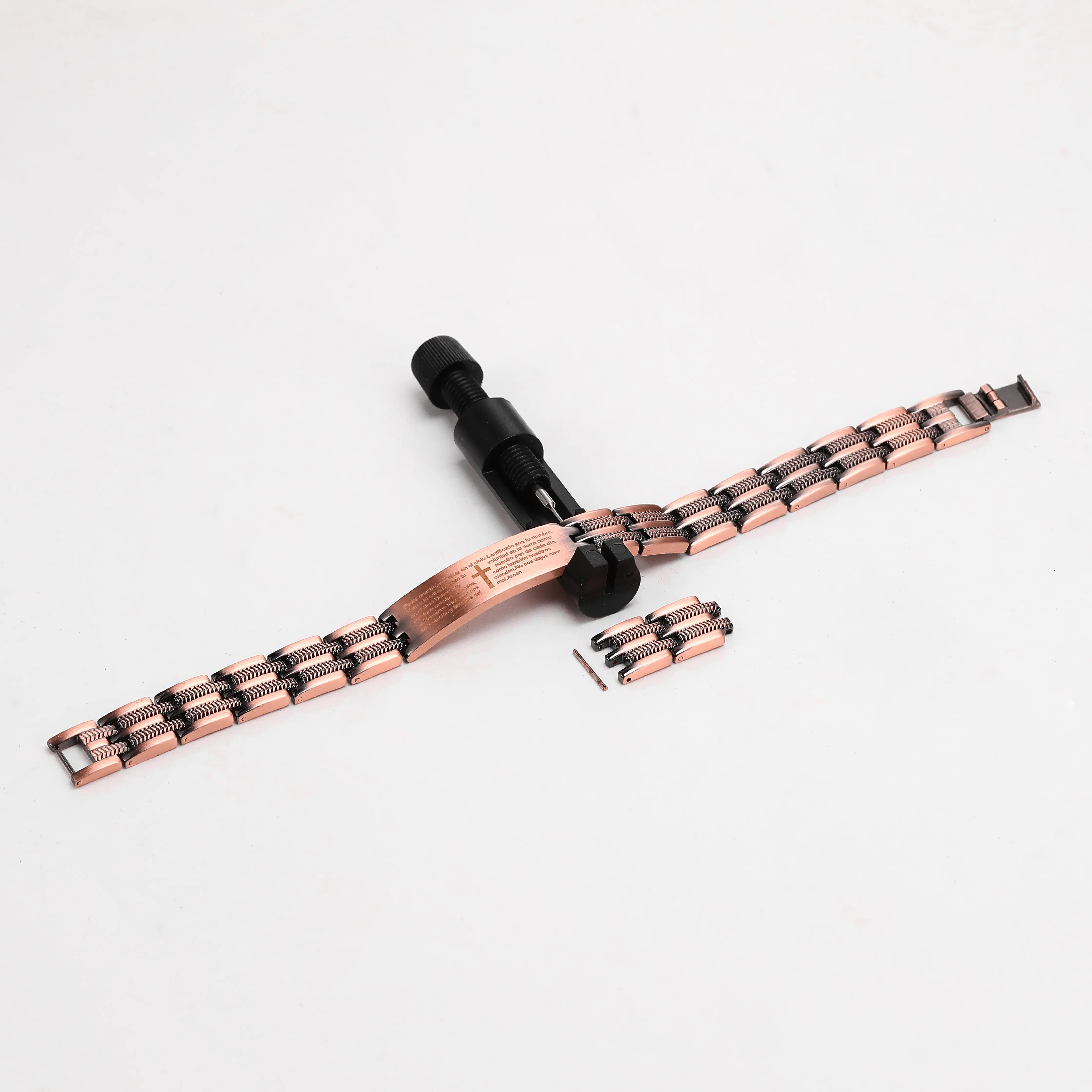 Pulsera de cobre para hombre con cruz y grabado del Padre Nuestro en español. Pulsera magnética ajustable con imanes integrados y cierre seguro. Diseño elegante y resistente, ideal para uso diario o como regalo con significado espiritual. Incluye herramienta de ajuste y caja. Jecanori copper cross bracelet para hombre con estilo y fe. #TikTokShop #JumpstartSale #PulseraDeCobre #PulseraConCruz #PulseraMagnetica