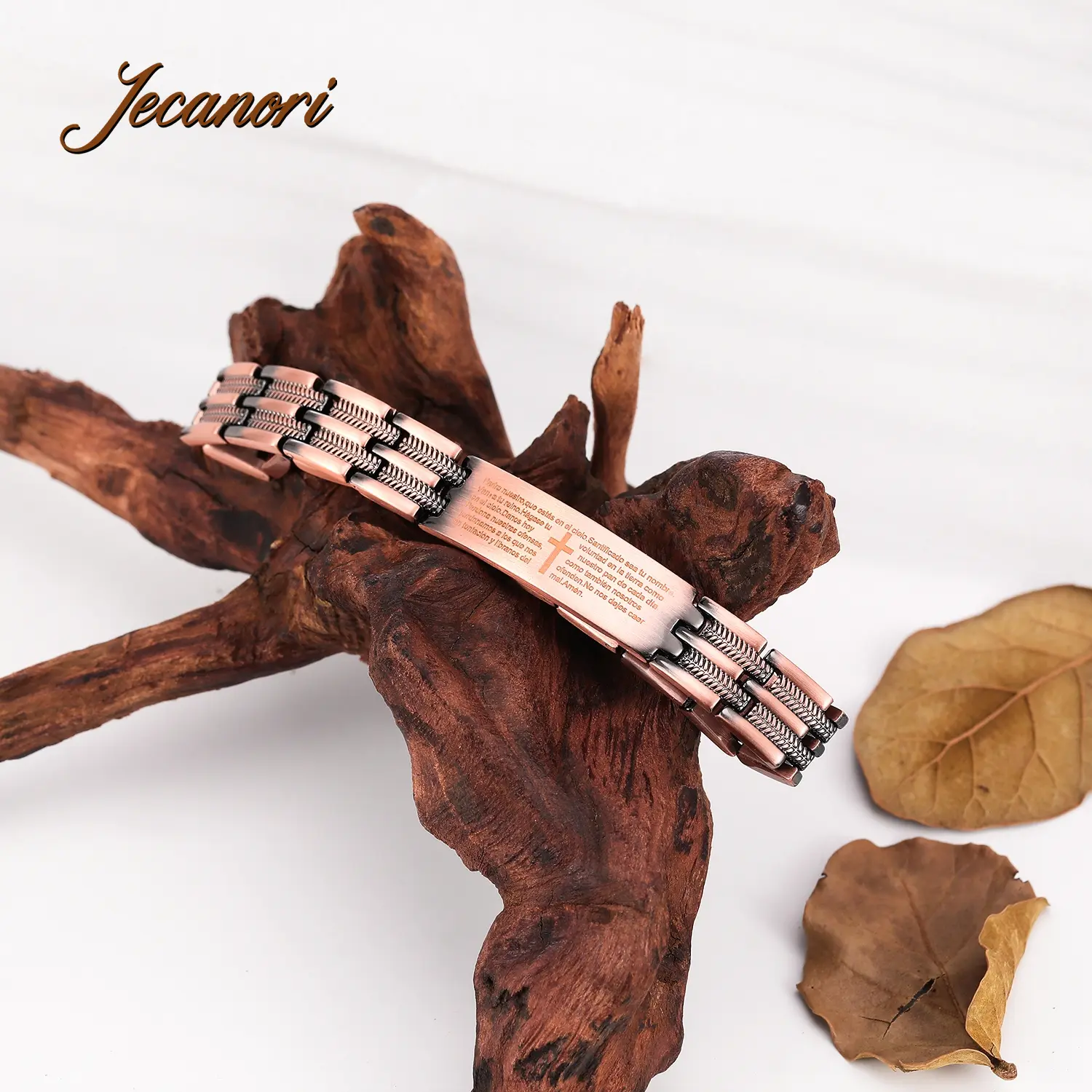 Pulsera Jecanori Copper Cross para hombre con Padre Nuestro grabado y cruz. Cobre puro con imanes ultra strength para circulación y bienestar según tradición. Ajustable con herramienta, cierre magnético seguro, cajita premium incluida. Diseño rudo con fe y estilo diario. #PulseraCruz #PadreNuestro #PulseraCobre #TikTokShop #JoyeriaMagnetica