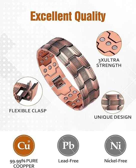 ·Ultra Magnetic Power --With powerful magnets (3500 Gauss each) per link, our copper bracelet harnesses the strength of neodymium, a rare-earth metal known for its strong and permanent magnetic field surrounding each magnet.