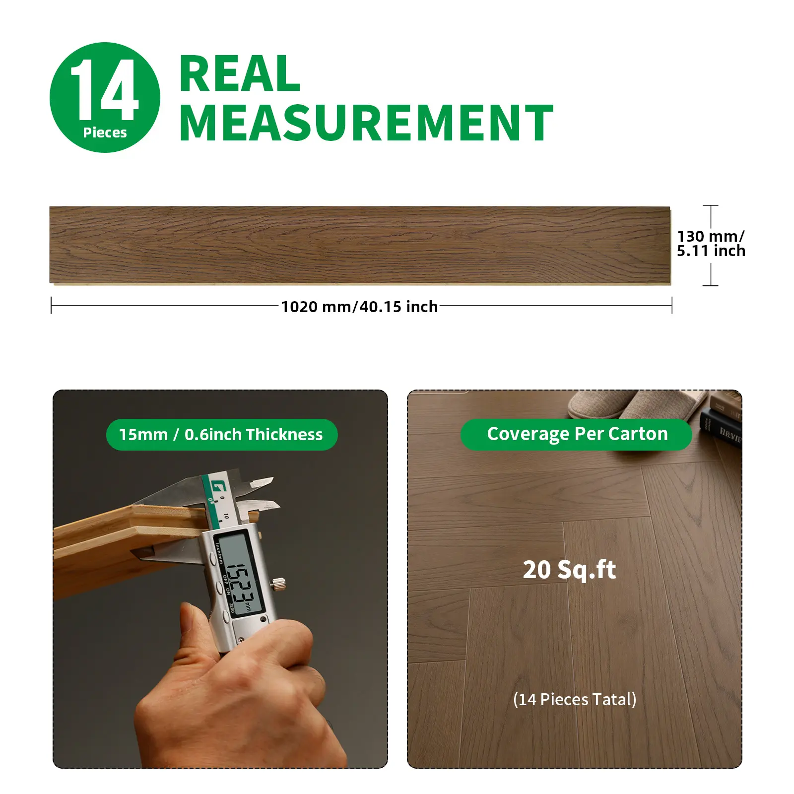 Color: Maroon. Gloss Level 10, Matte surface, natural and rustic. Dimension: Each plank measures 5.11 inches in width, 40.15 inches in length, and 3/5 inch in thickness. Each package includes 14 pieces, covering 20 square feet.