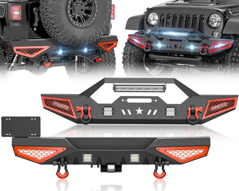 ·【Powerful Towing Capacity】EYOUHZ JK front bumper features a 12,000 lbs winch plate designed to accommodate a powerful winch for heavy-duty recovery. EYOUHZ JK rear bumper includes a 2" hitch receiver, providing a convenient connection for towing racks, cargo carriers, bicycles, and more. Each bumper includes two 4.75-ton D-rings (9,500 lbs each), offering secure anchor points for towing and recovery.