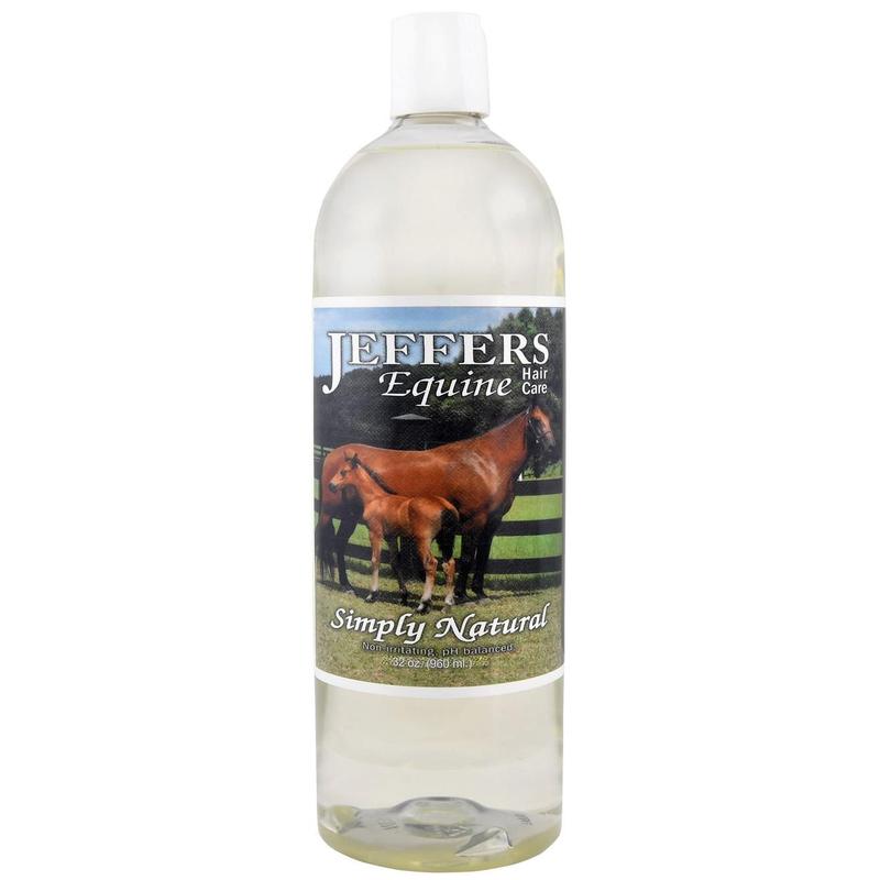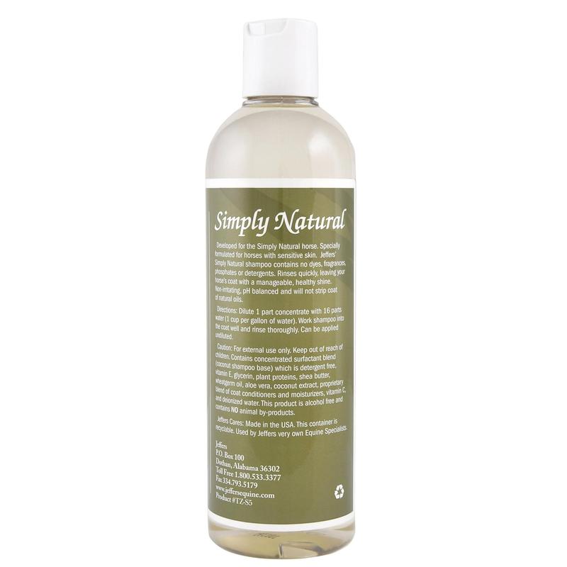 Jeffers Equine Simply Natural is a gentle, non-irritating, and pH-balanced shampoo specially formulated for horses with sensitive skin. Made with a coconut-based surfactant blend and enriched with vitamin E, vitamin C, aloe vera, shea butter, wheatgerm oil, and plant proteins, this shampoo conditions and moisturizes while it cleans. Free from dyes, fragrances, phosphates, detergents, alcohol, and animal by-products, it provides a safe and soothing cleanse that won’t strip the coat of its natural oils. It rinses quickly, leaving the coat soft, manageable, and with a healthy shine.