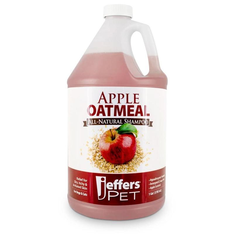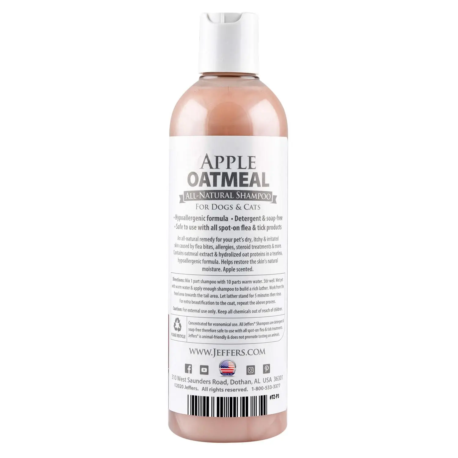 Jeffers Apple-Oatmeal Pet Shampoo is an all-natural, tearless formula designed to soothe dry, itchy, and irritated skin caused by flea bites, allergies, steroid treatments, and more. Enriched with oatmeal extract and hydrolyzed oat proteins, this hypoallergenic shampoo helps restore natural moisture while leaving a refreshing apple scent. Safe for both dogs and cats.