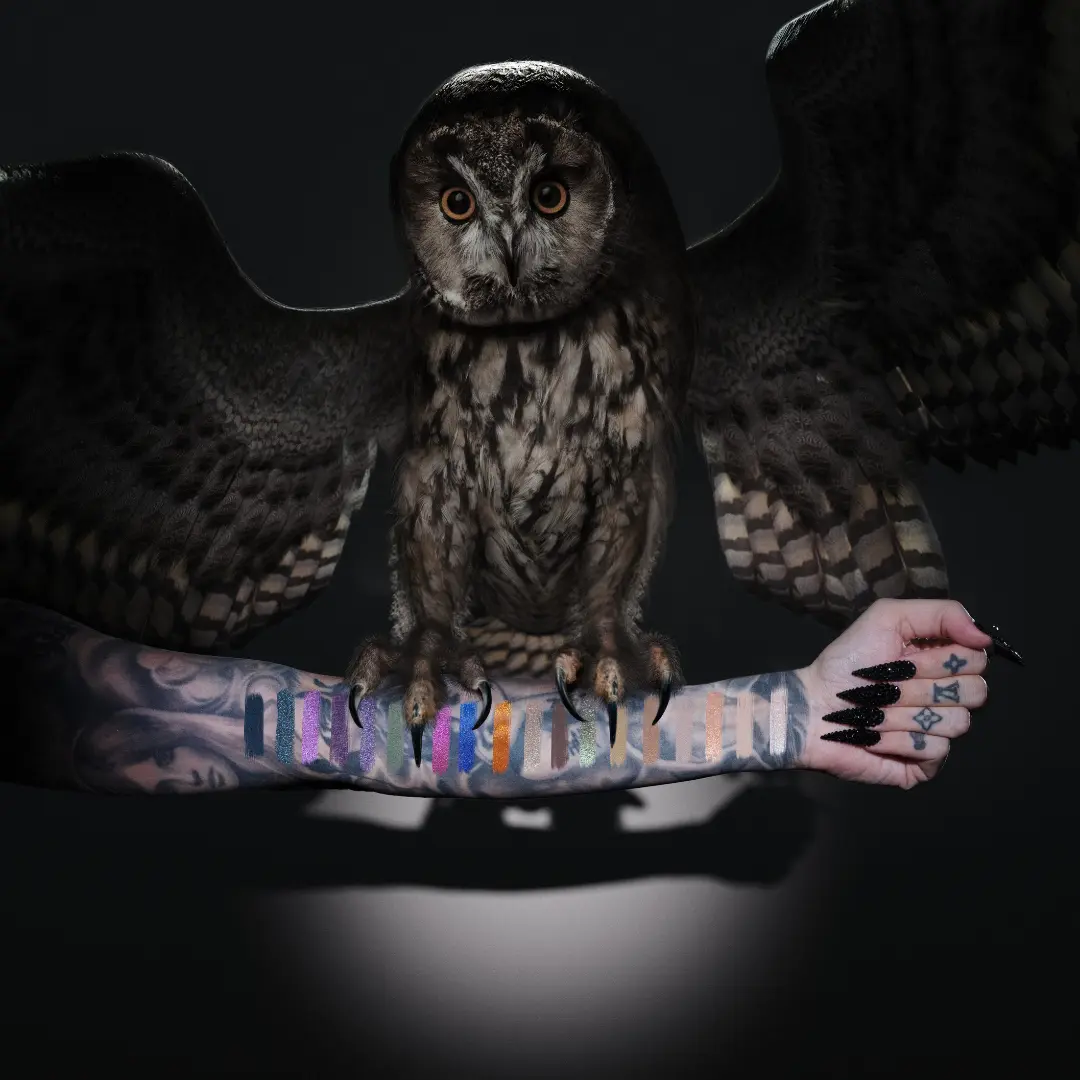 Step into the shadows and let your creativity soar with our Night Owl Artistry Palette. Features 18 shades designed for dreamers, creators, and cosmic souls.Inspired by the mysteries of the night sky, each richly pigmented shade delivers depth and dimension, perfect for looks that mesmerize from dusk ‘til dawn.