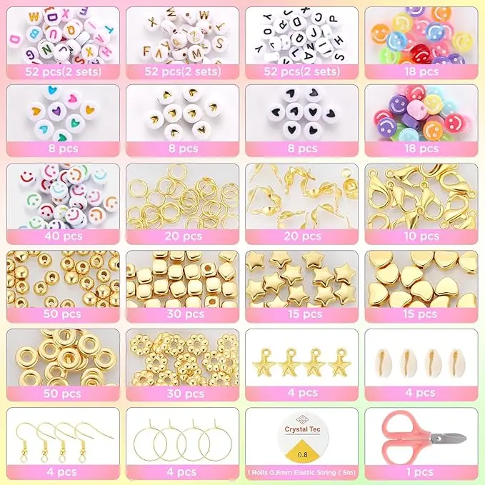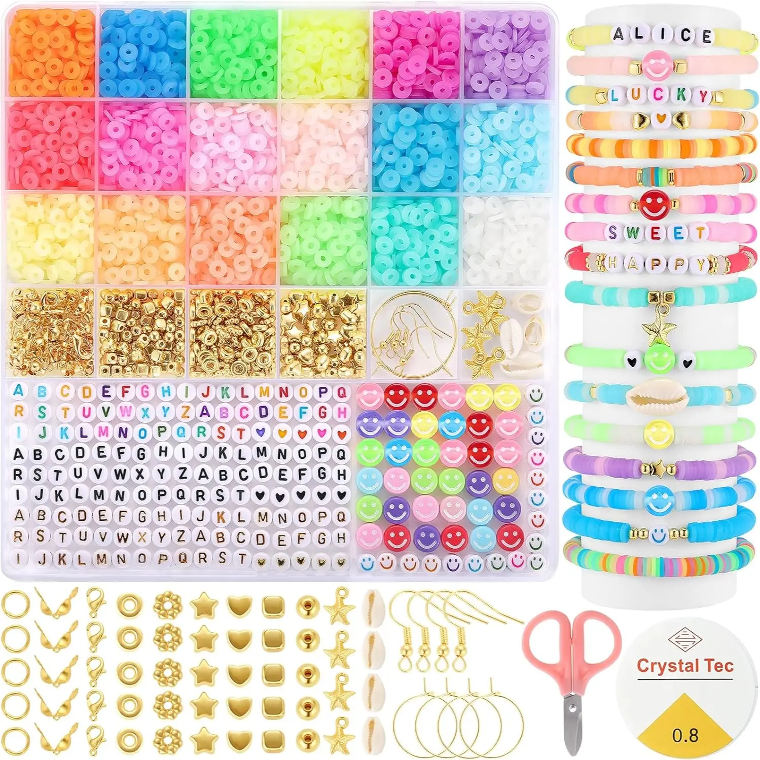 · 【What You Will Get】The clay bead bracelet kit includes 4500Counts flat round clay beads, 6 complete sets of A-Z letter beads, 76Counts smile face beads, 24Counts heart beads, 4Counts clamshell beads, 252Counts metal charm kit, 1 roll of 0.8mm elastic string and 1 pair of scissors.