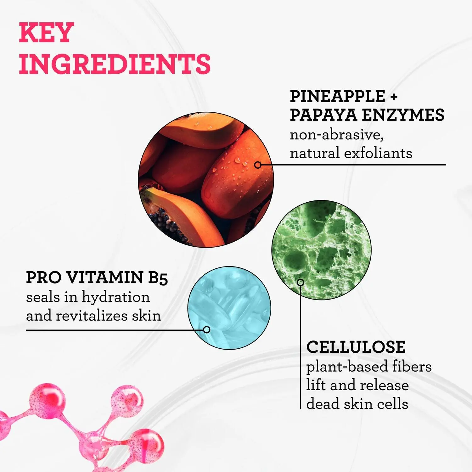 ·Pineapple & Papaya Enzymes: Act as non-abrasive, natural exfoliants to help loosen dead skin cells for easy removal