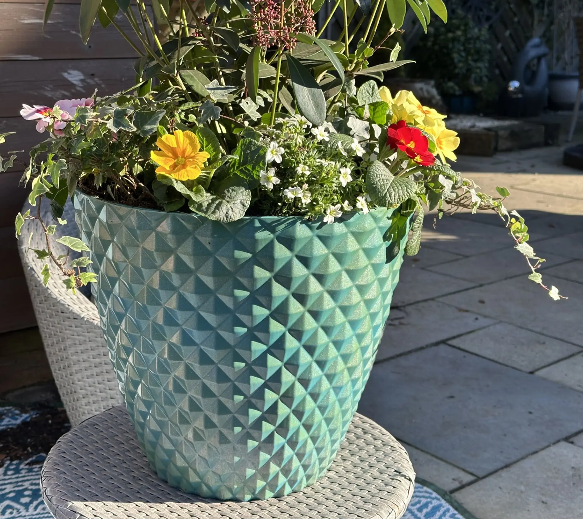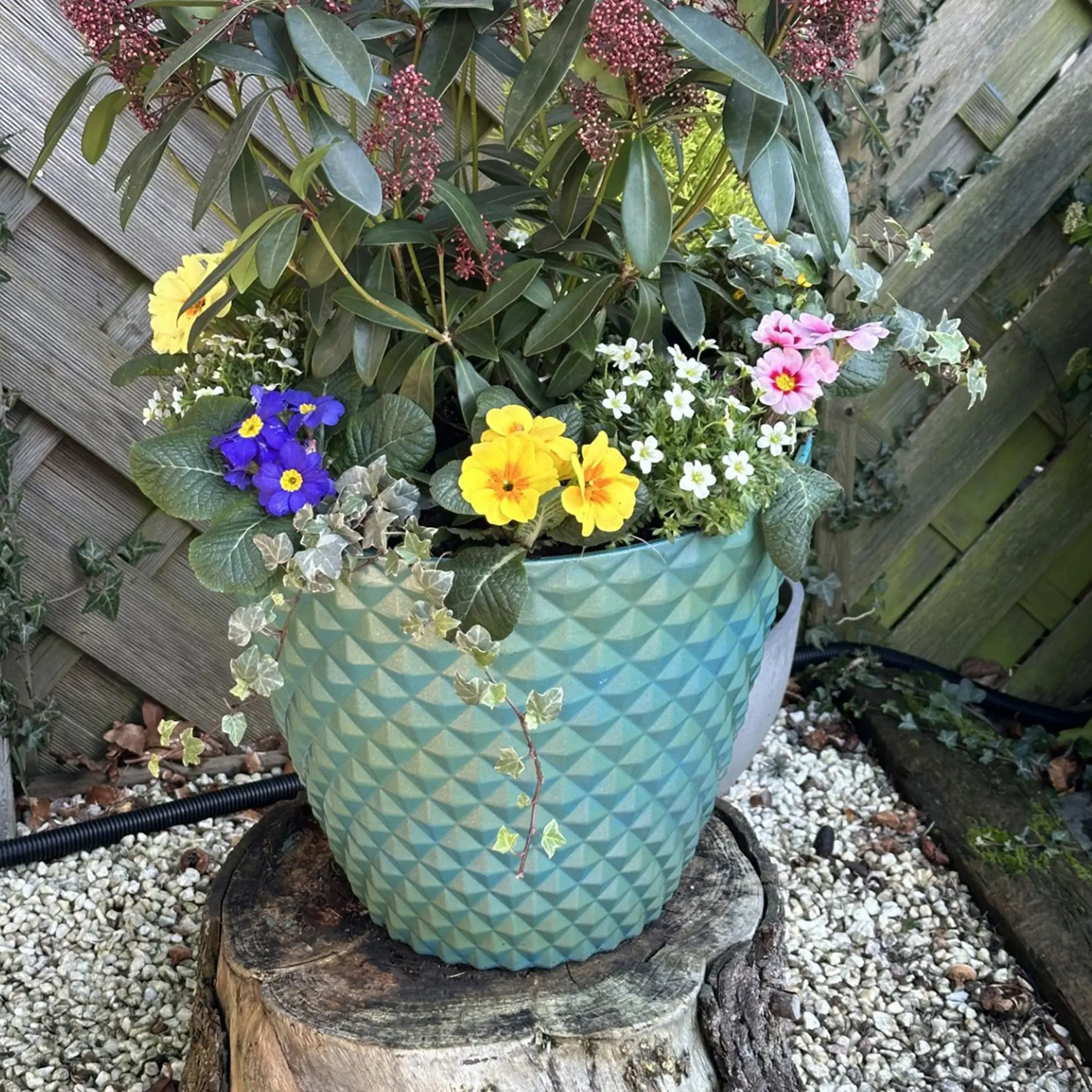 Spring porch refresh but make it designer-looking planters without the designer price. 🌿 These XL diamond texture outdoor planters by Jennings are one of my favorite finds for patio decor, front porch styling, and spring flower arrangements. The 15” large size makes them perfect for geraniums, lavender, hydrangeas, petunias, or mixed flower planters. I grabbed the blue color but they also come in sage and pearl white, so they work with almost any outdoor patio aesthetic — coastal, cottagecore, modern garden, or classic porch styling. They’re lightweight but large, have drainage holes to prevent overwatering, and you get a set of two oversized planters, which is perfect for front door symmetry or patio styling. If you’re looking for large outdoor planters, patio flower pots, or front porch decor for spring and summer, these are such a good find. @QVC, Inc #qvcnewarrivals #qvc #outdoorplanters #springporchdecor #gardentok  large outdoor planters blue outdoor planter spring porch decor patio flower pots front porch planter ideas extra large flower pots outdoor gardening planters spring patio decor front door planter decor geranium planter ideas lavender planter pots hydrangea planter ideas cottagecore garden decor outdoor porch styling large decorative planters TikTok Shop garden decor