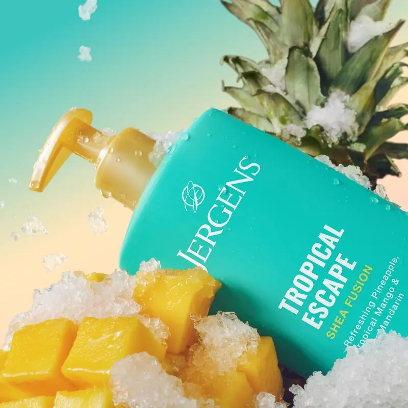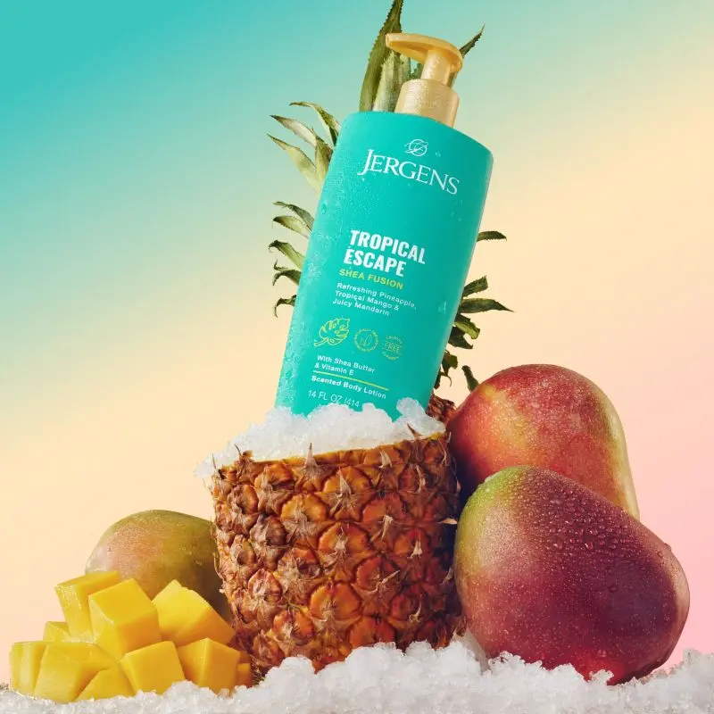 Your new tropical island crush just landed. Meet Jergens Shea Fusion Tropical Escape Scented Body Lotion. Bright fruit, flirty vibes and skin that feels vacation soft. It’s satiny smoothing moisture with a refreshing pineapple, tropical mango, and juicy mandarin scent. Made with naturally derived African shea butter and Vitamin E, this moisturizer nourishes your skin to feel smooth and supple. Get touchably smooth hydration that lasts all day–up to 24 hours! Indulgent, scented lotion that really crushes it. This is a dermatologist tested body lotion that is cruelty free, paraben free and contains no artificial dyes. Jergens Shea Fusion is a collection of scented, 24 hour body lotions, swirled with addicting scents. Explore our whole collection of addictively scented moisturizers. Jergens Shea Fusion body lotion also comes in Vanilla Crush and Warm Amber. No matter which moisturizer you select, it’s touchably soft hydration with can’t-get-enough scent. One whiff, and you’re in deep. New Jergens Shea Fusion Tropical Escape Scented Body Lotion. Bright and breezy. Fresh and flirty. A beachy mood-boosting scent with enough hydration to keep your skin in its softest era.