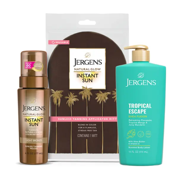 Jergens Instant Sun brings on the sunshine whenever you’re ready to glow. No swimsuit or sand required! If you want deeply sunkissed, flawless skin without exposing your skin to harmful UV rays, meet Jergens Instant Sun Light Bronze sunless tanning mousse, your beach in a bottle. This self tanner is formulated to work with your unique skin tone to deliver flawless natural-looking color that mimics beautiful color from the sun without the unpleasant sunless tanner odor. The natural, sun-free glow will make you never want to get a spray tan again! This tanning foam formula with our Advance Color Complex dispenses into an airy mousse that spreads evenly for a flawless tan that dries in just 60 seconds. The flawless tan gradually deeps to an elegant, award-winning bronze glow within a few short hours. Jergens Instant Sun can help even out your overall skin tone for a more polished look from head to toe. And this tanning mousse is not just for women. It’s the perfect way to get a glow for all. Looking for a man tan? Jergens Natural Glow Instant Sun Light Bronze will have you glowing in no time. Jergens Natural Glow Instant Sun Light Bronze offers safe, hassle-free color, even when the beach is miles (or months) away. Simply apply using our Instant Sun sunless tanning mitt, included. The mousse is tinted for precise applications. It delivers stunning, streak-free results. Jergens Instant Sun allows you to get the perfect tan every time. If you want an even deeper color, you can use this tanning foam again the following day. In the winter months, Jergens Natural Glow Instant Sun Light Bronze will give you that “just back from a 5-star resort” glow. This formula is infused with coconut water and has a tanning active derived from natural sugars. It delivers stunning, streak-free results with a formula that is Paraben Free, Cruelty Free, and Dermatologist Tested.