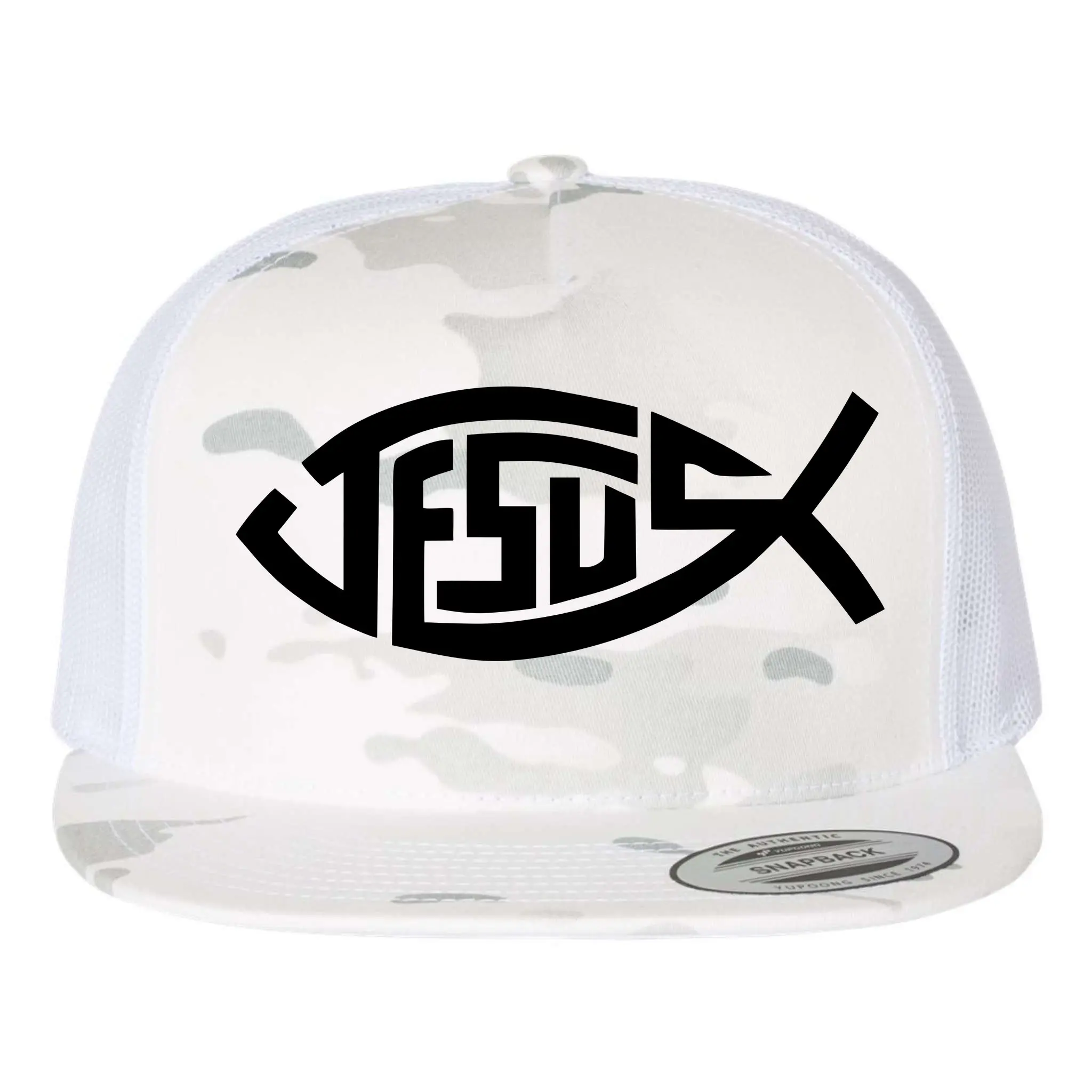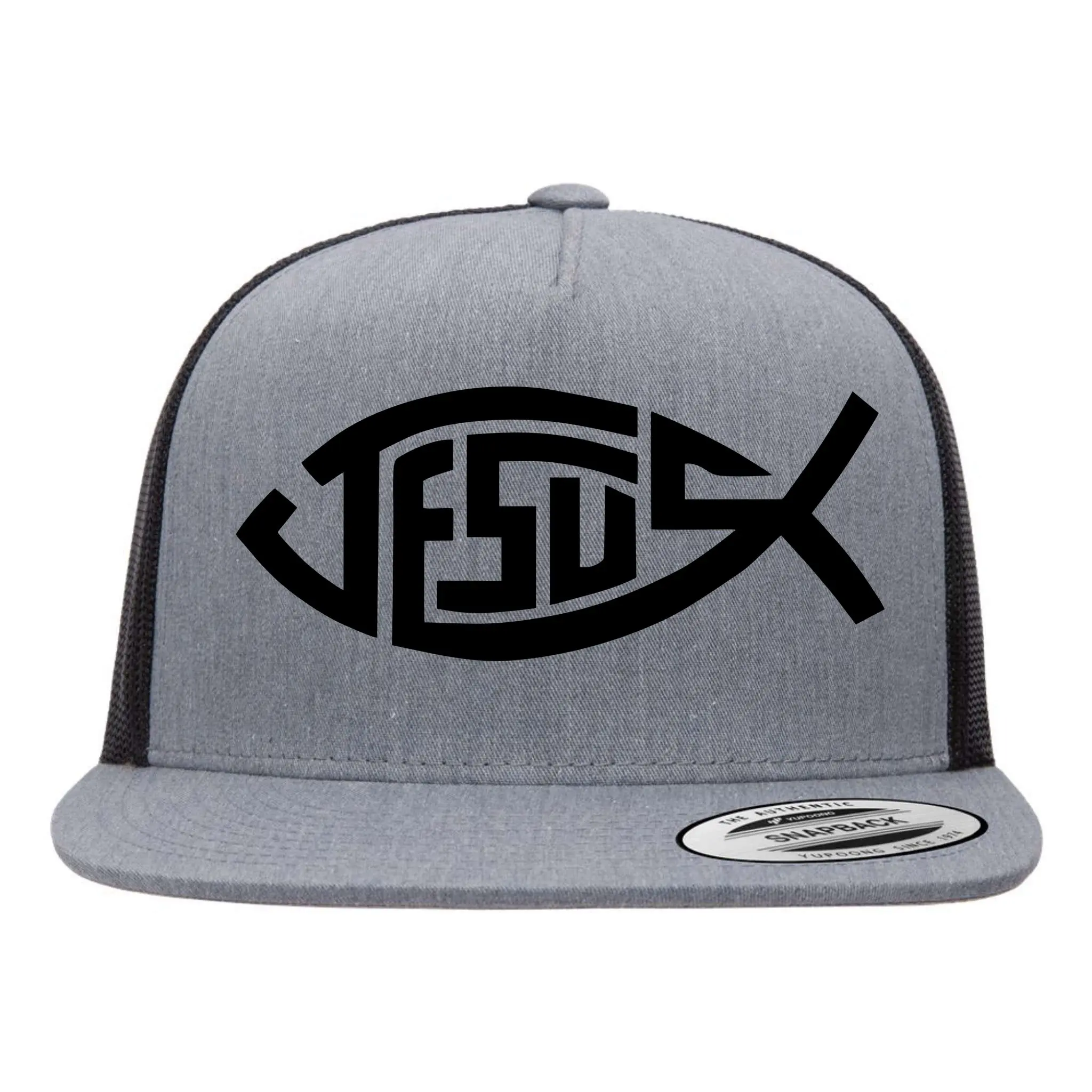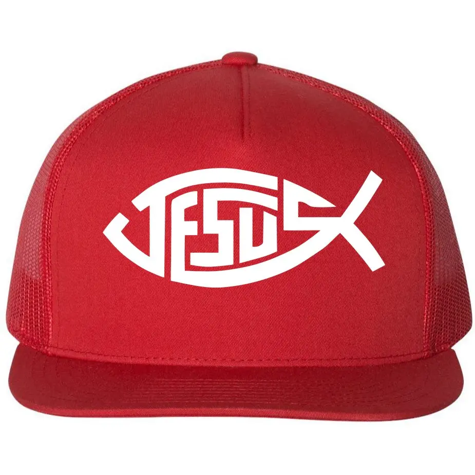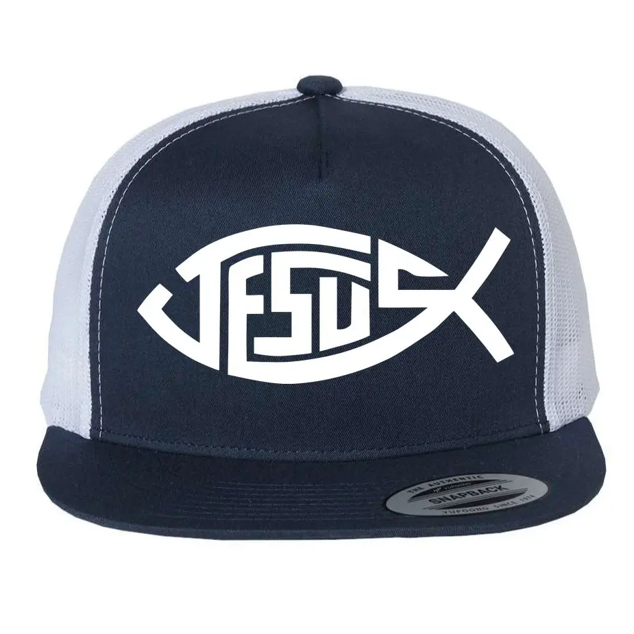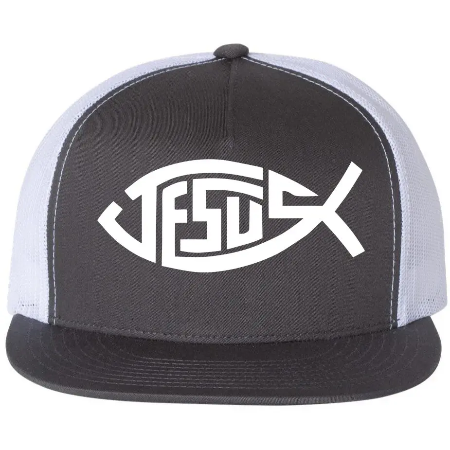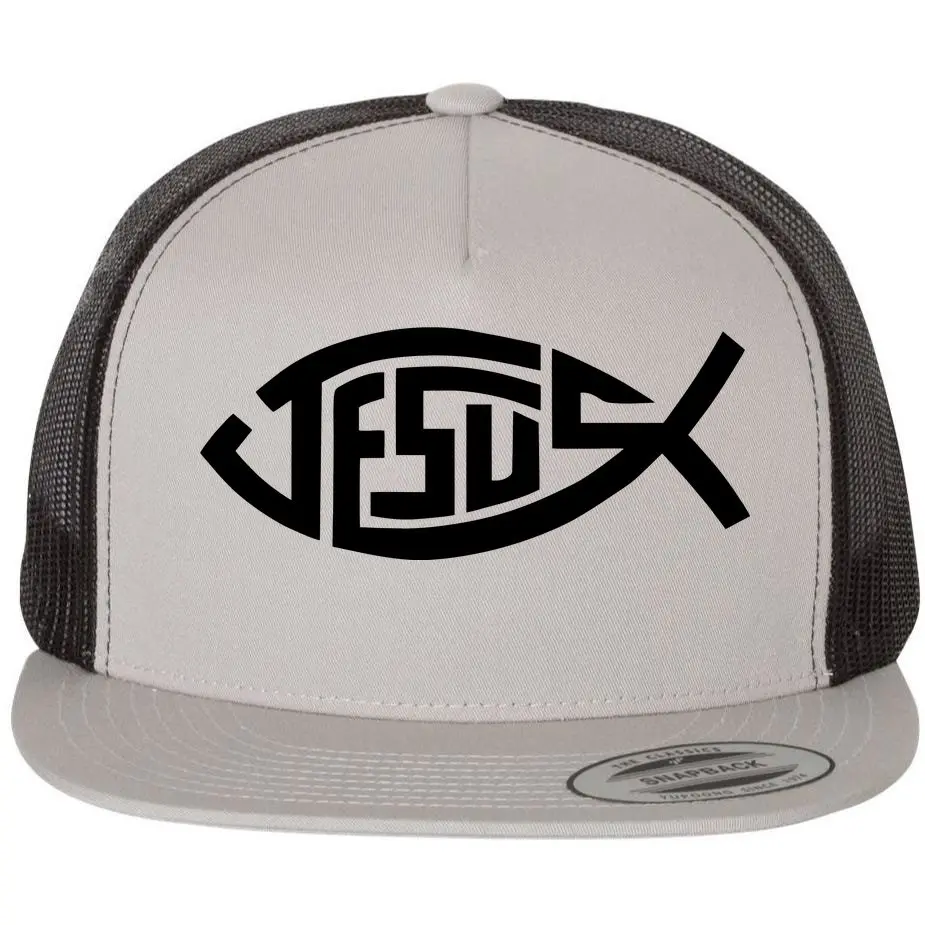 This Jesus Fish Logo Flat Bill Trucker Hat is perfect for Christian Catholic followers of Christ who want to stylishly represent their faith.