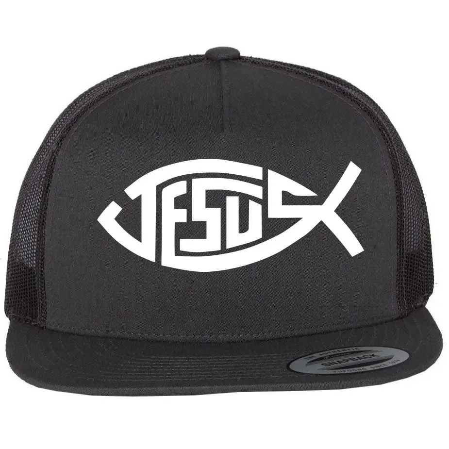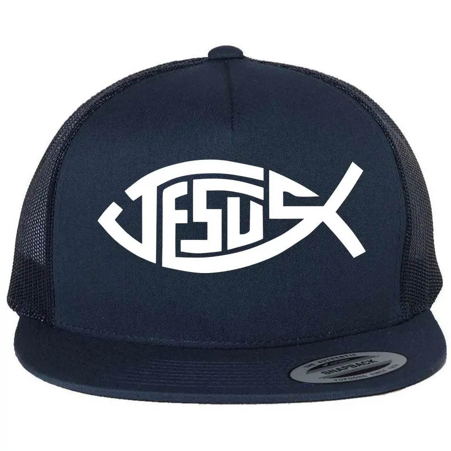 Jesus Fish Logo Christian Catholic Follower of Christ My God Flat Bill Trucker Hat For Men Women #jesus #jesusfish #fishlogo #christian #catholic #followerofchrist #mygod #truckerhat #hatformen #hatforwomen #trending #viarl