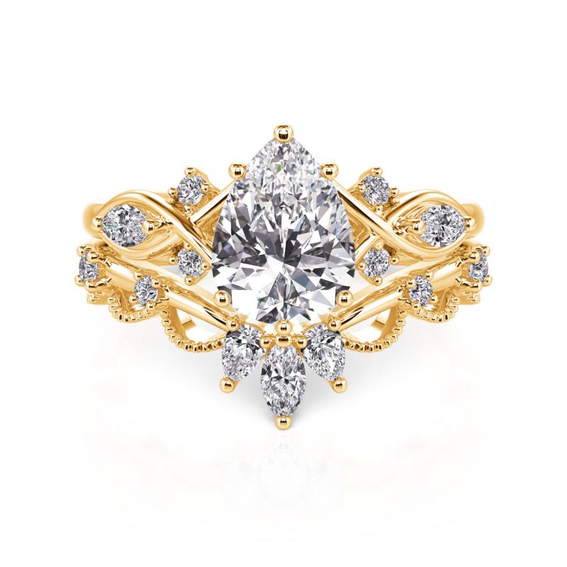 The secondary ring's converging lines complement the pear-shaped stone's extension, embodying modern innovation for ceremonial weddings.