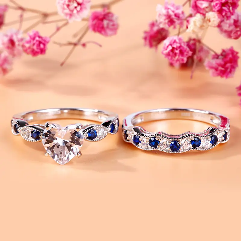 Celebrate your love with this exquisite wedding set. Beautifully crafted in sterling silver, this entrancing design features a shimmering heart cut stone at the center, while the shank and matching band are adorned with alternating blue stones and shimmering white stones arranged between intricate milgrain borders. On your wedding day, seal your vows and celebrate your commitment with this beautiful ring set.