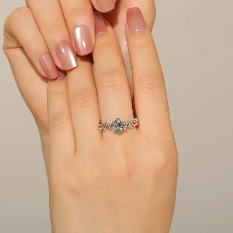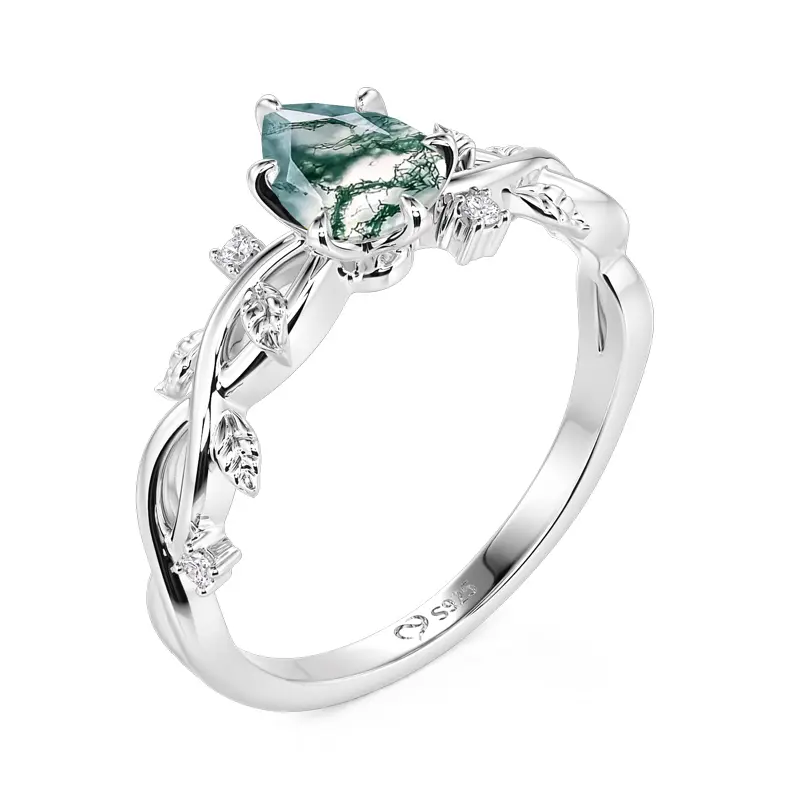 The Jeulia pear cut Moss Agate engagement ring beautifully intertwines nature-inspired elegance with modern design. It features a stunning pear-cut moss agate at its center, showcasing the stone's unique, earthy patterns. The twisting band, crafted from sterling silver, elegantly resembles intertwining leaves, adding a charming organic touch. Each curve catches the light, enhancing the overall allure.