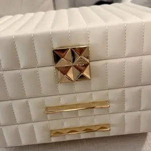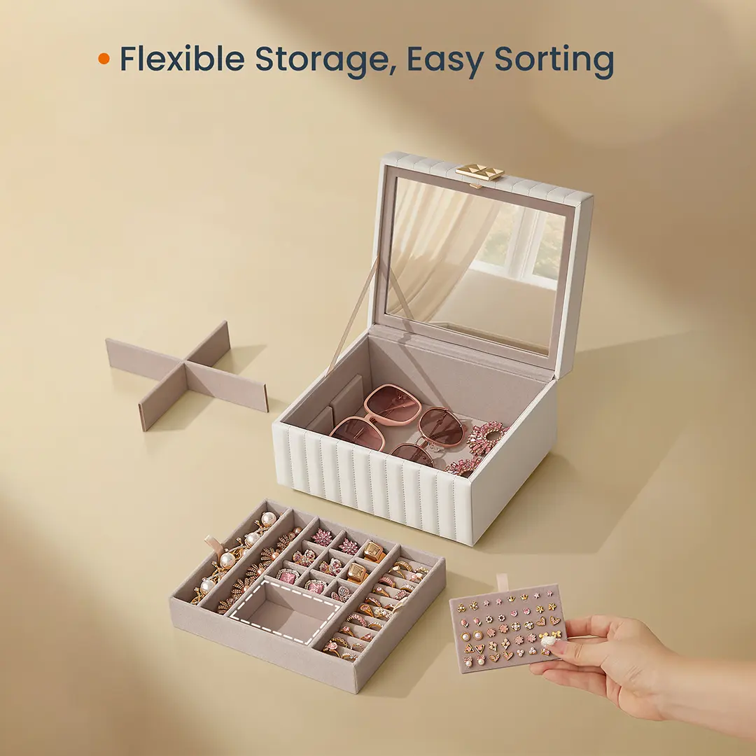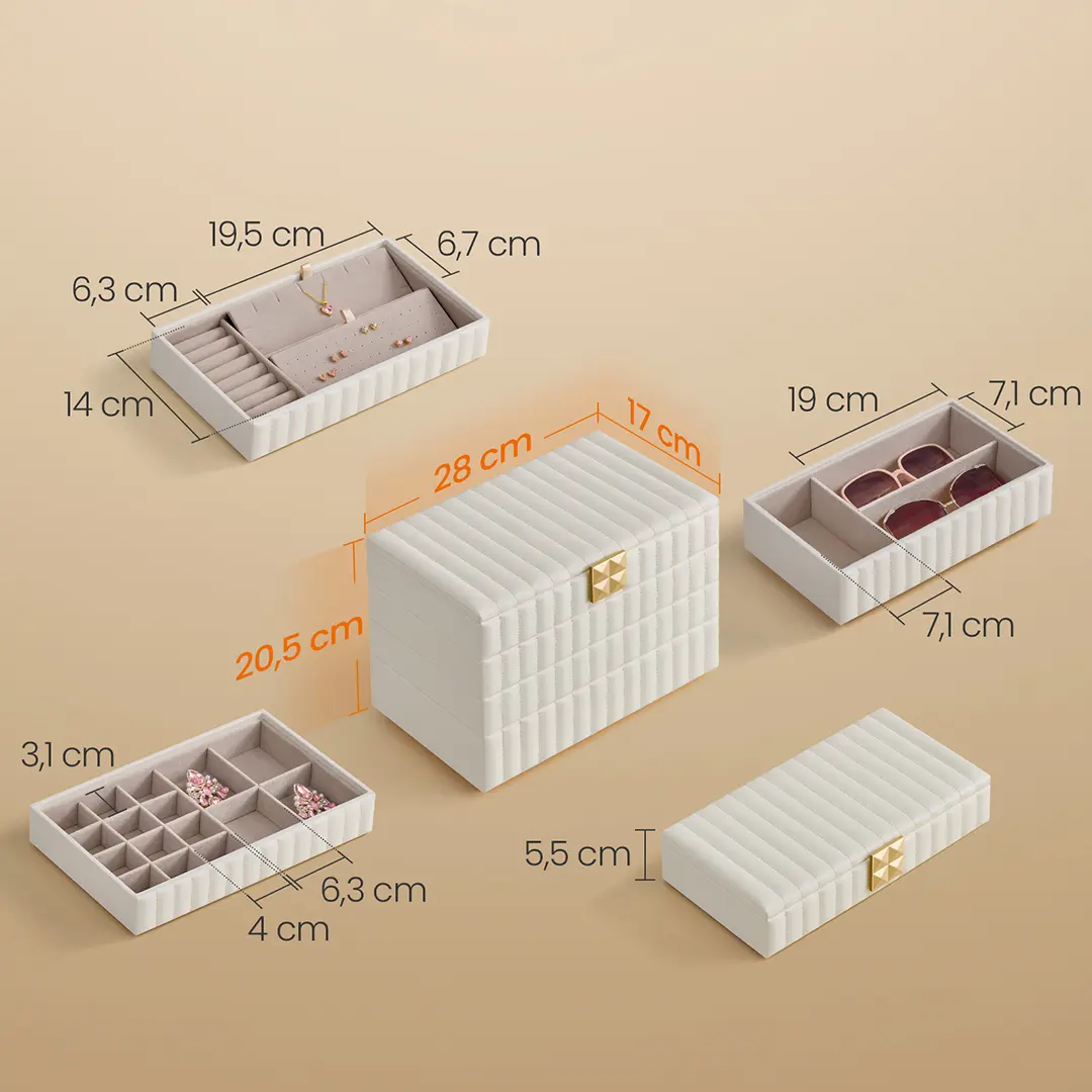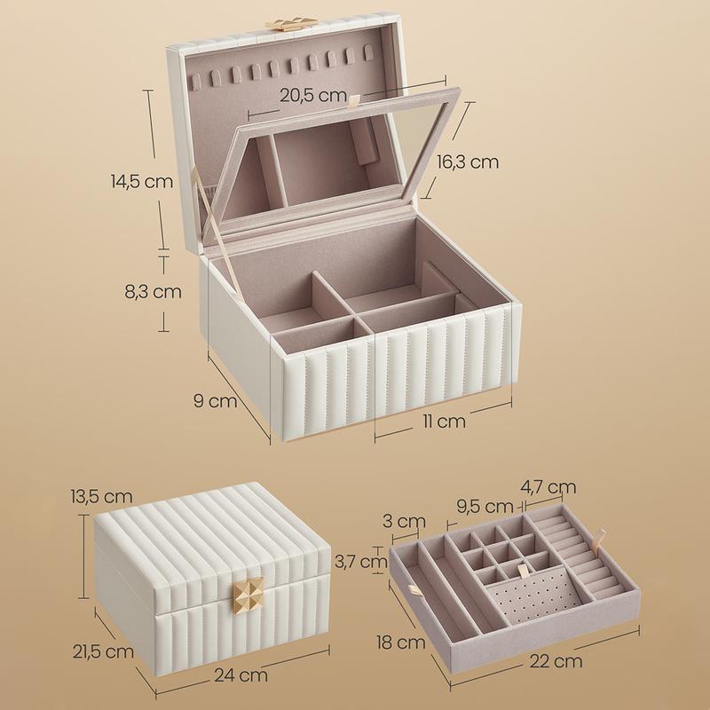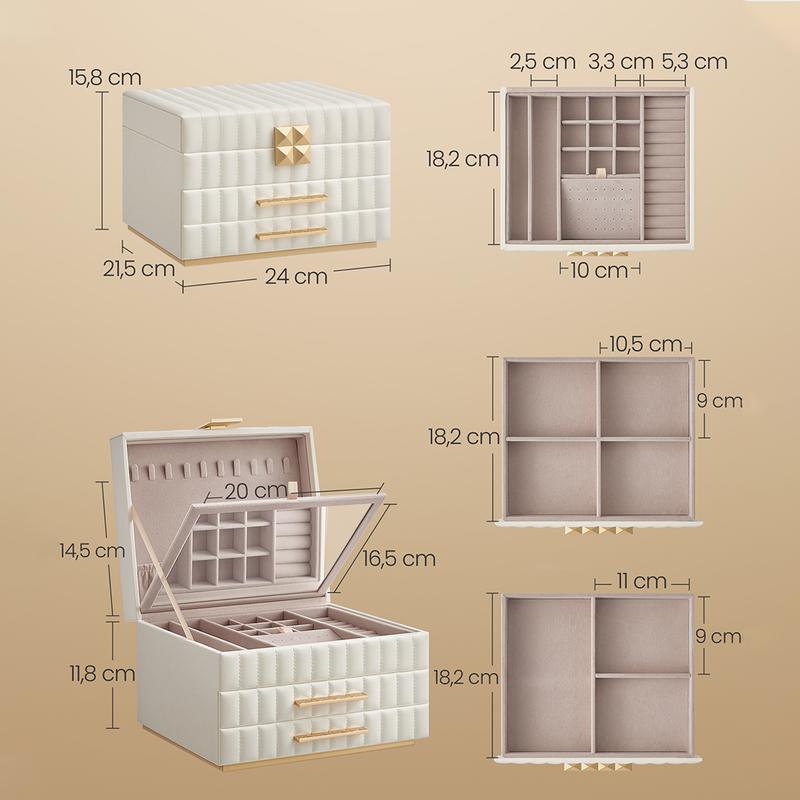 The SONGMICS HOME ANAH Collection beckons you to indulge in the beauty of organized opulence, designed especially for those who cherish their precious gems and trinkets. Feel the smooth caress of its surface, admire the intricate quilted stitching, and marvel at the pyramid-styled hardware that elevates your treasures to new heights.