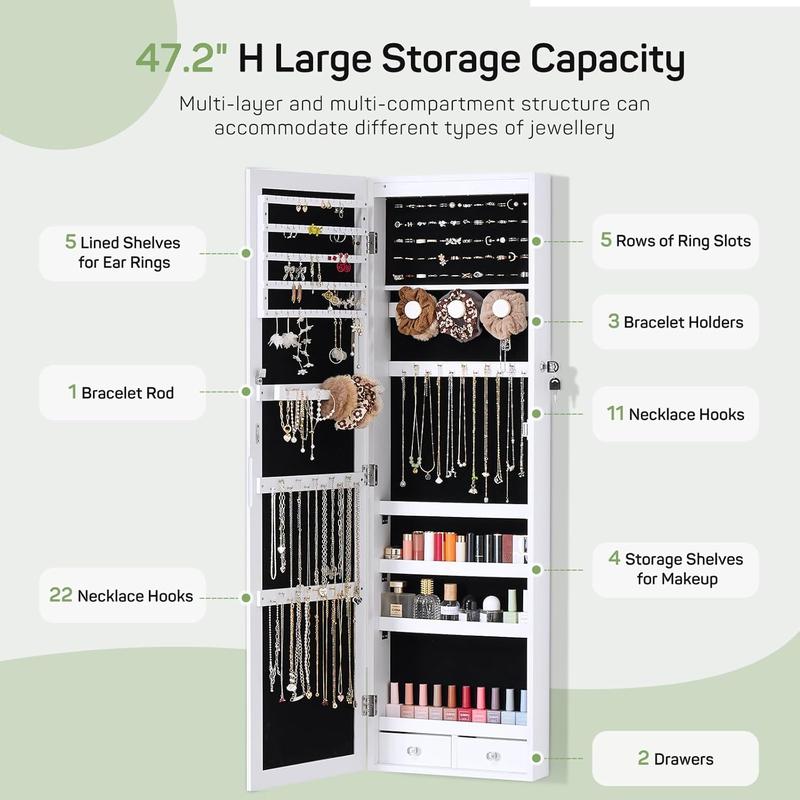 ·[Large Storage Capacity] Featuring a massive 47.2 inches of storage space! Our jewellery cabinet is spaciously designed to make it easy to store all your jewellery in one place.1 large ring pad, 1 bracelet bar, 2 bottom drawers, 4 shelves, 33 necklace hooks, 40 earring holes, and 75 earring slots are fully functional, making it easy for you to pick up and put down your items.