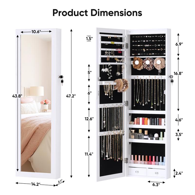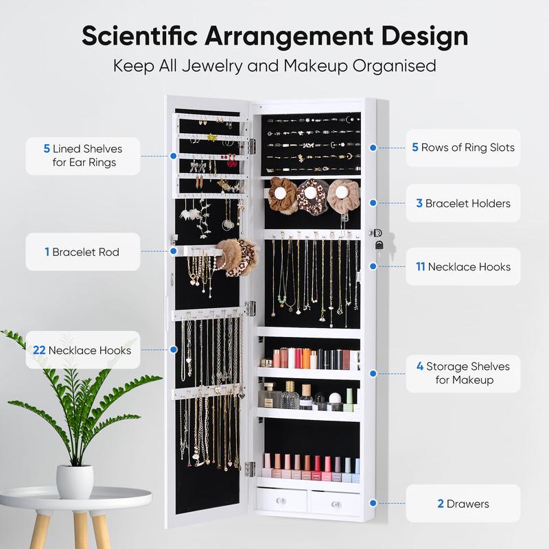 【Large Storage Capacity】Featuring a massive 47.2 inches of storage space! Our jewellery cabinet is spaciously designed to make it easy to store all your jewellery in one place.1 large ring pad, 1 bracelet bar, 2 bottom drawers, 4 shelves, 33 necklace hooks, 40 earring holes, and 75 earring slots are fully functional, making it easy for you to pick up and put down your items.