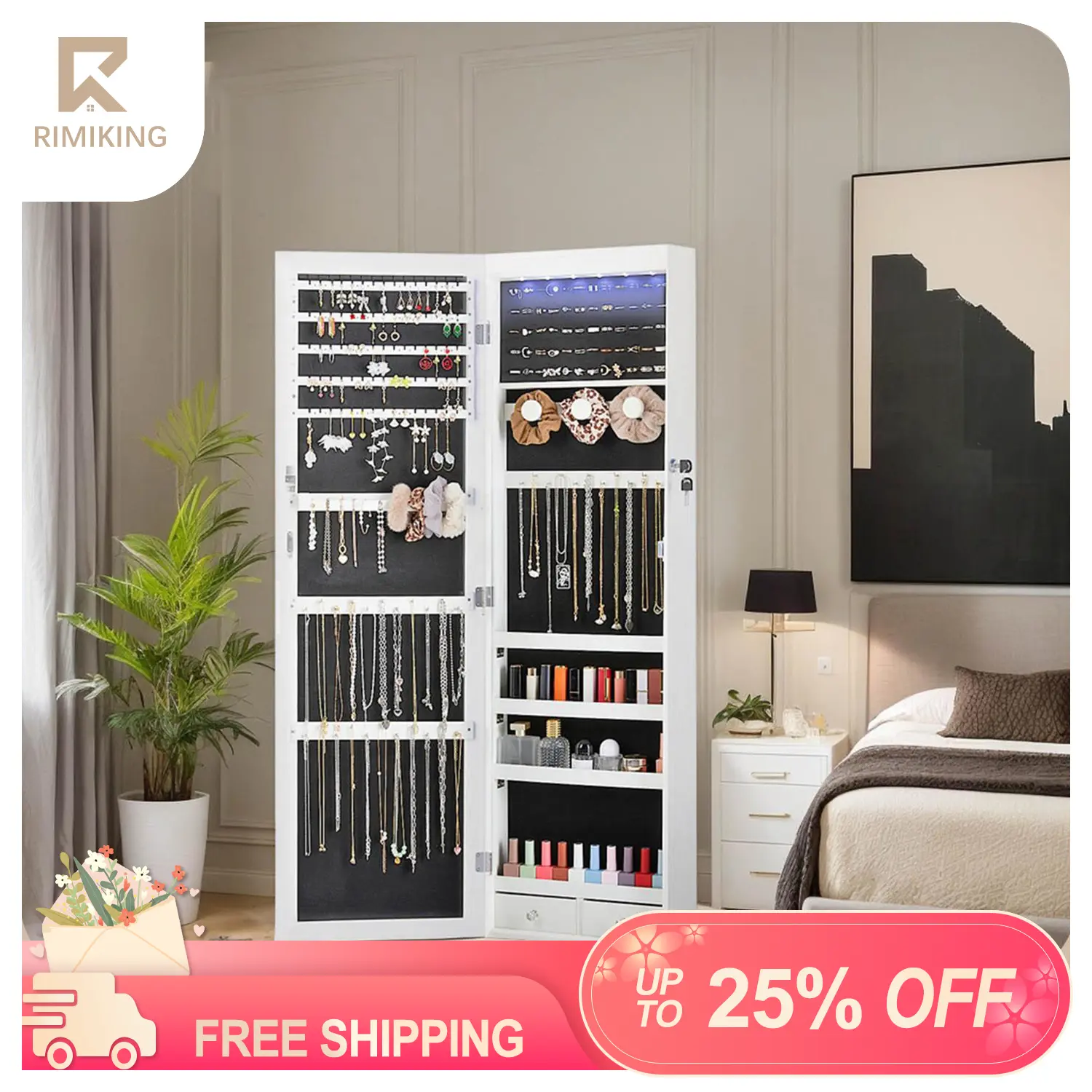 Ample Storage: 47.2" tall cabinet with large storage capacity including 90 earring slots, 48 stud earring holes, 84 ring slots, 6 LED lights, 32 necklace hooks, 1 bracelet rod, a 3-tier cosmetic organizer, and 2 drawers.