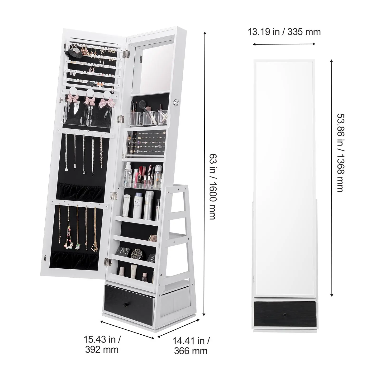 • 3-in-1 Functionality: The VEVOR swivel standing mirror with storage is not only a jewelry organizer but also a full-length mirror, providing a head-to-toe view of your outfit. It features the large foldable storage drawer and shelves, making it an essential daily item for every girl.