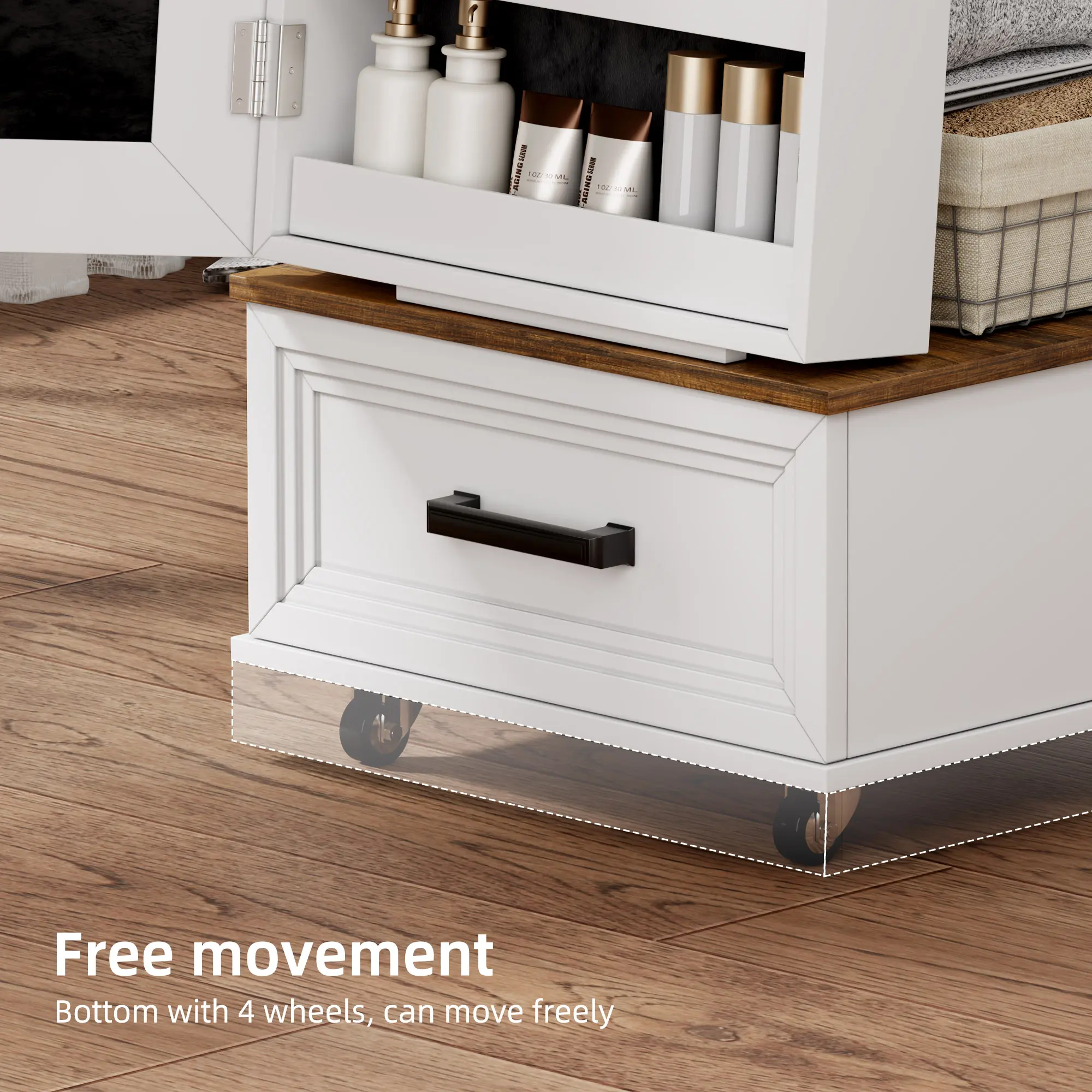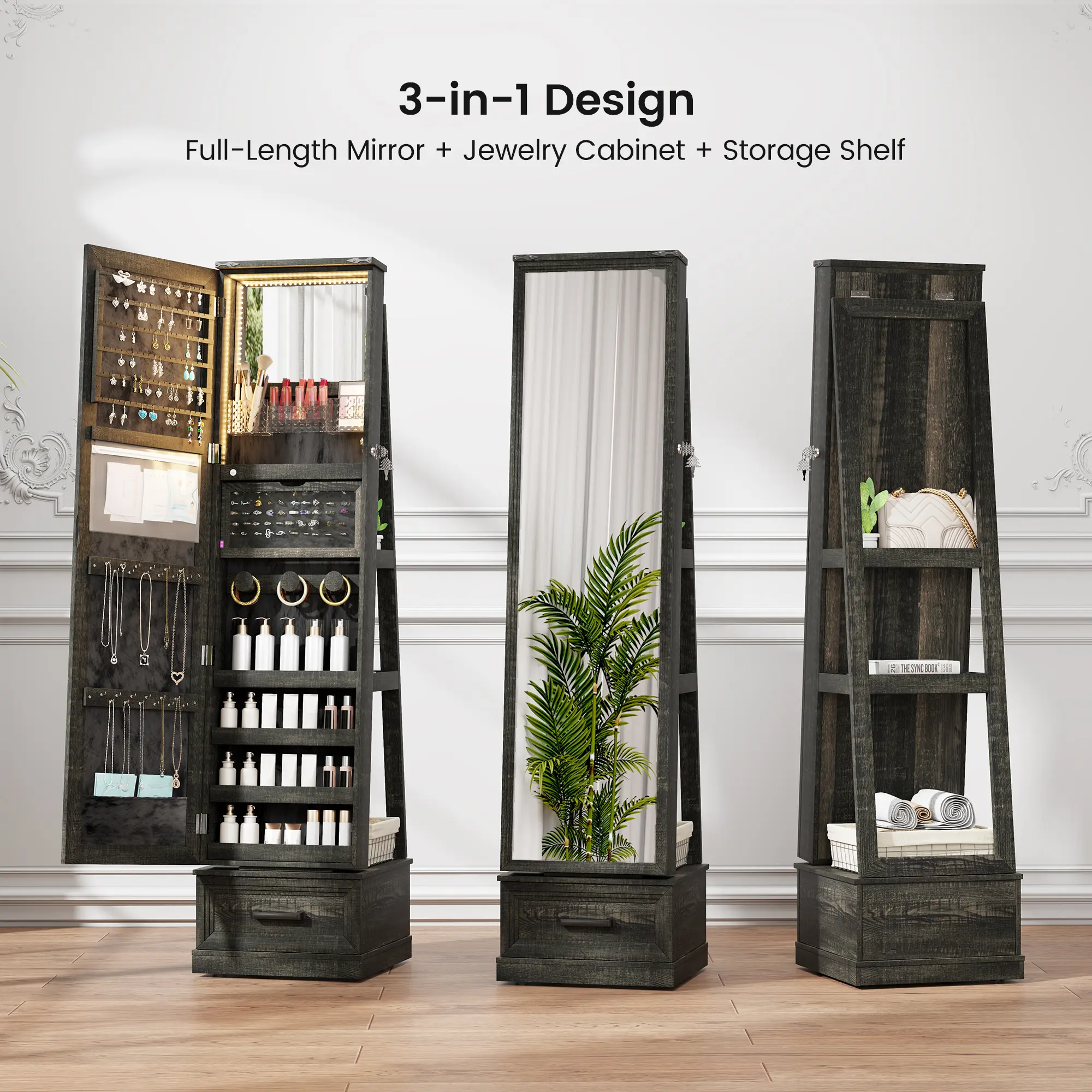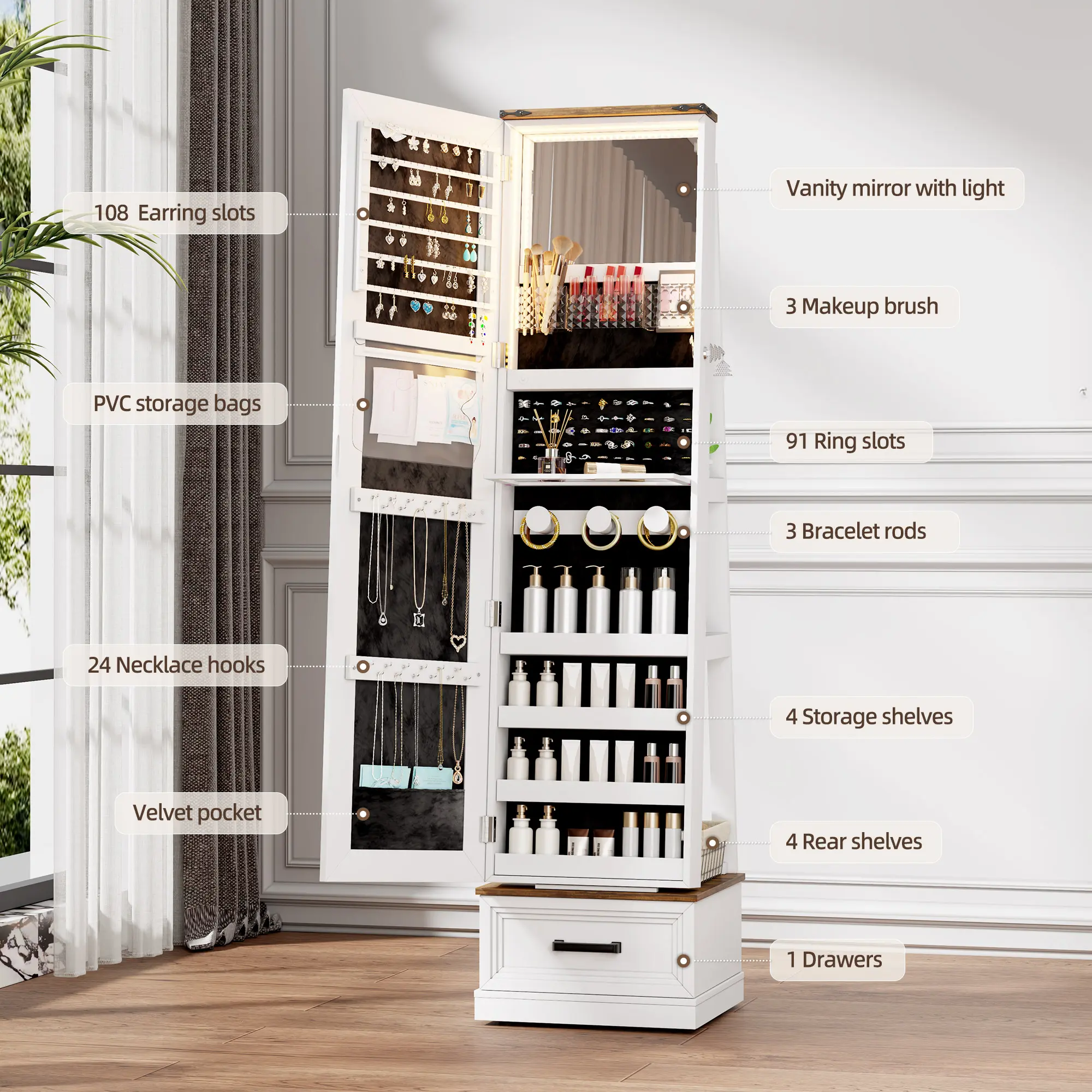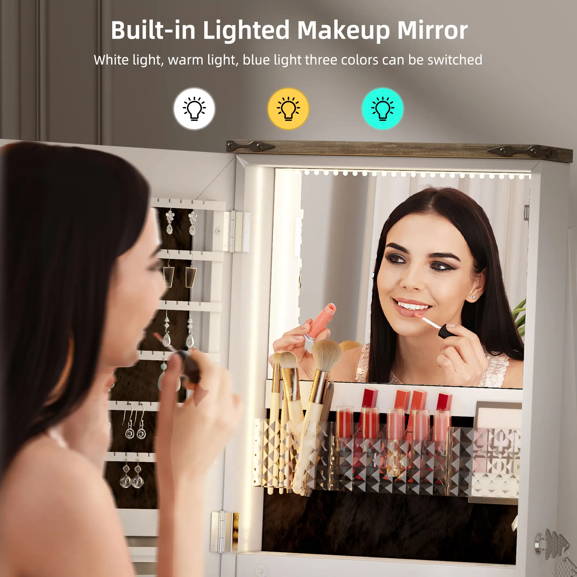 This elegant standing jewelry organizer features a full-length mirror, ample jewelry storage, an integrated makeup mirror with 3-color lighting, three storage shelves behind, and a separate large wooden drawer, catering to all your storage needs.