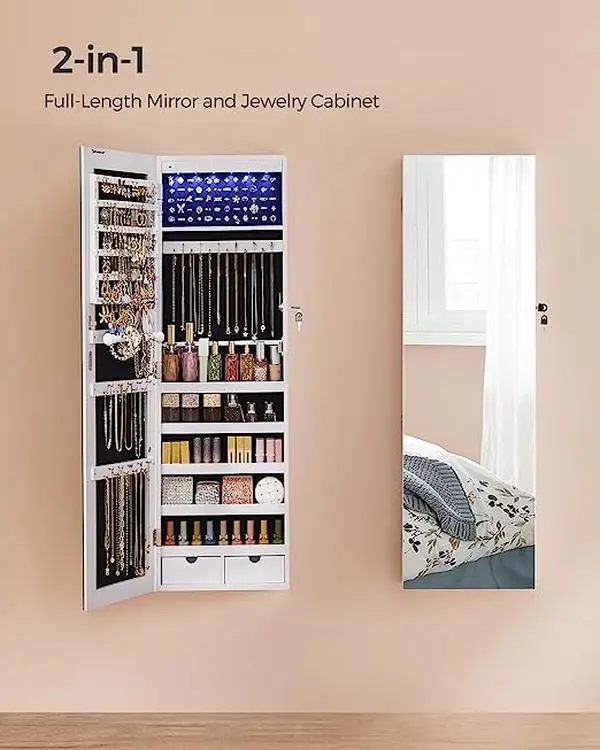 ·KEEP IT SIMPLE: Simply hang this hanging jewelry cabinet on the door frame of your bedroom or bathroom using the hooks provided. Of course, you can also fix the jewelry cabinet to a solid wall using the screws supplied
