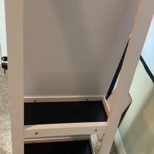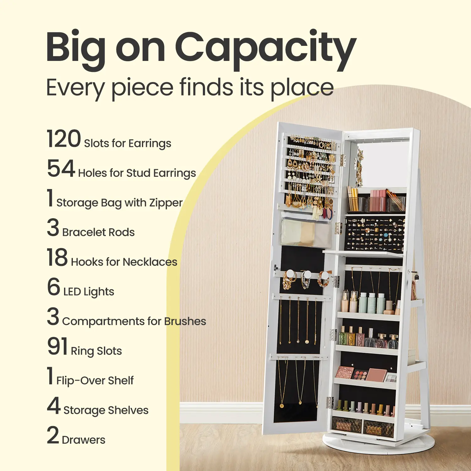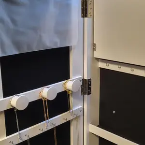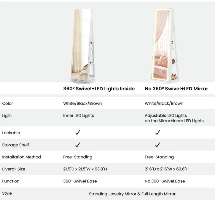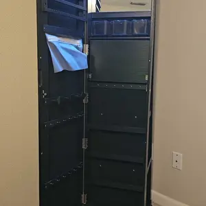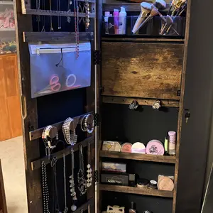 Very disappointed with this item. It was advertised as having LED lights inside and outside—mine had none. There was no bracelet area, no protective cover for rings, and no lower jewelry rows as shown in the pictures. Assembly was frustrating and parts were missing😥😥