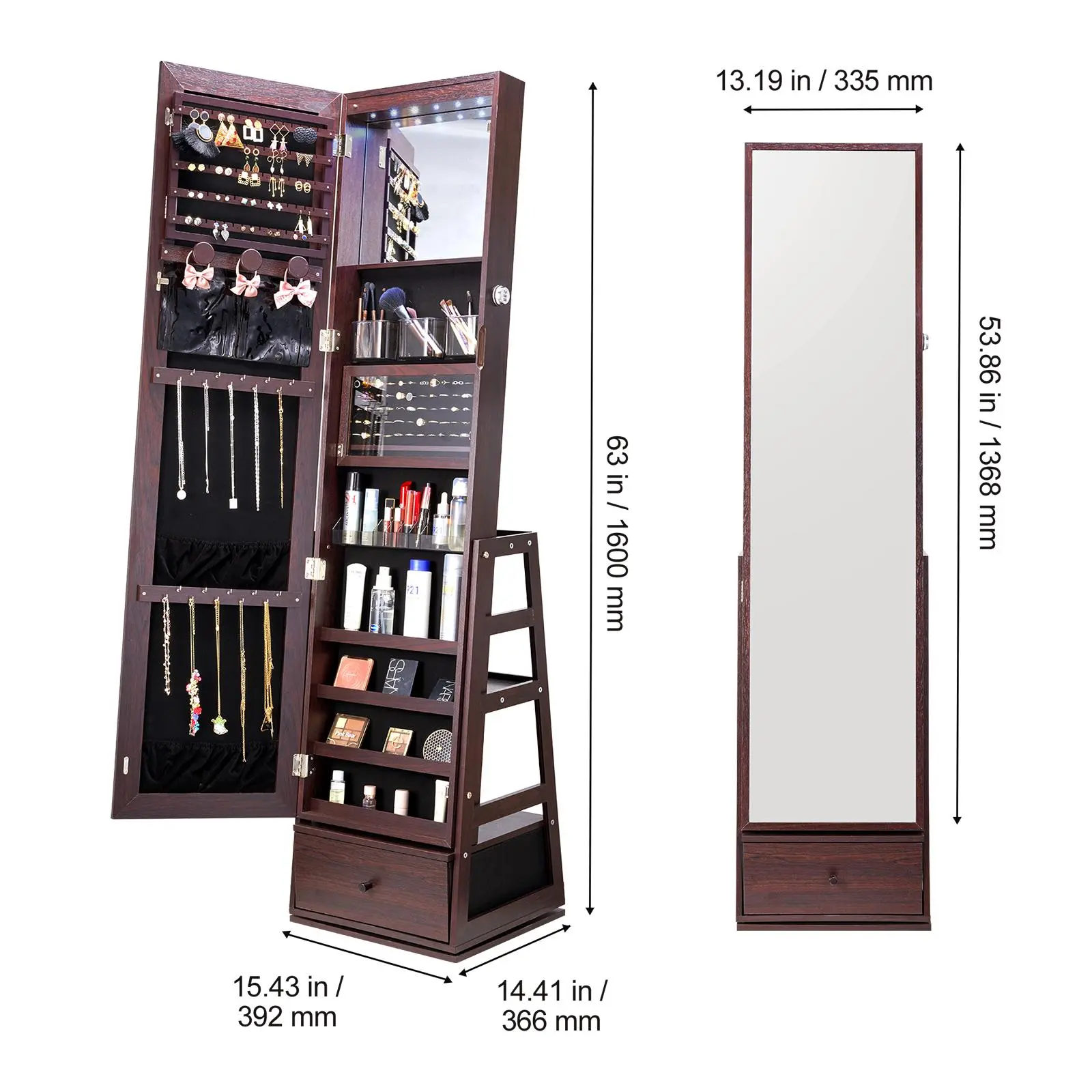 • 3-in-1 Functionality: The VEVOR swivel standing mirror with storage is not only a jewelry organizer but also a full-length mirror, providing a head-to-toe view of your outfit. It features the large foldable storage drawer and shelves, making it an essential daily item for every girl.