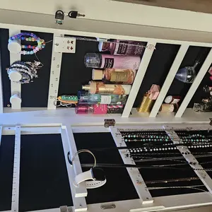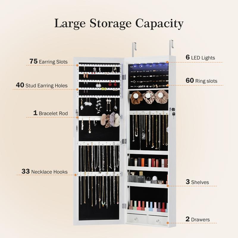 ·【Large Storage Capacity】 Featuring a massive 47.2 inches of storage space! Our jewellery cabinet is spaciously designed to make it easy to store all your jewellery in one place.1 large ring pad, 1 bracelet bar, 2 bottom drawers, 4 shelves, 33 necklace hooks, 40 earring holes, and 75 earring slots are fully functional.