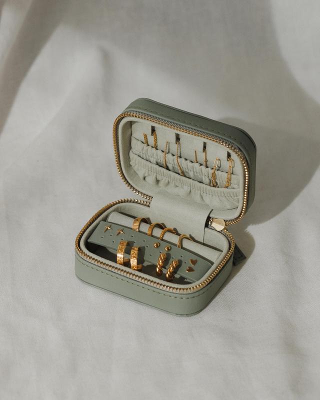 This jewelry case is just what I was looking for! It holds a lot of jewelry and fits perfectly in my purse for traveling. I also love the sage green color! I do wish that the ring holder was thicker on one end because while it holds my midi rings well, the rest of my rings are too loose and it makes it a little difficult to properly place and secure them.
