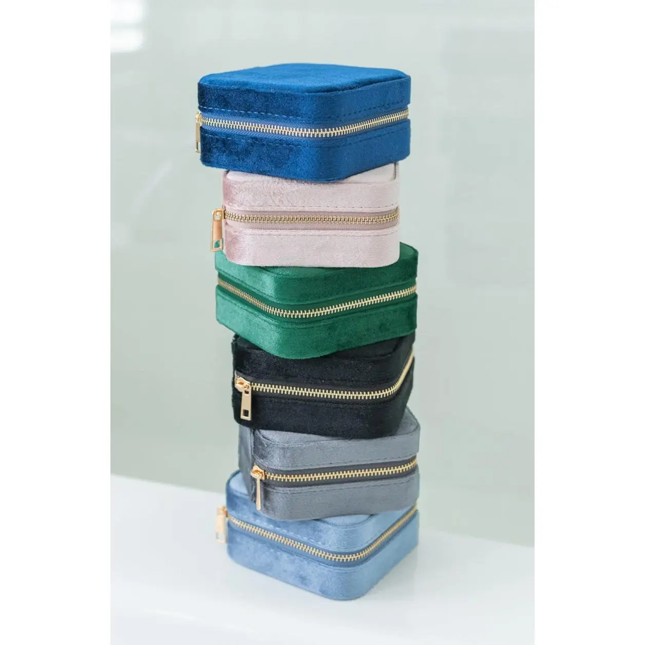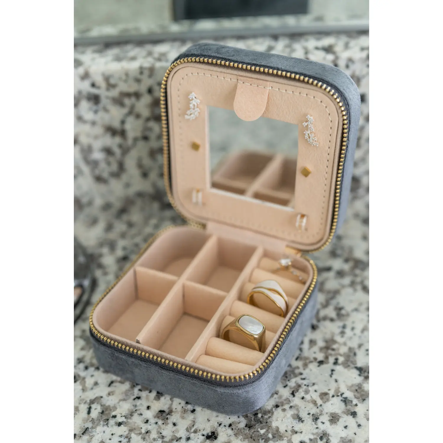 Your gorgeous accessories deserve an equally stunning jewelry case! This luxe velvet jewelry box is sure to lend an elevated feel to your travels or your dresser at home. The Eloise features three necklace hooks, a mirror, six earring holes, ring slots, and a section with adjustable, removable tabs for extra organizational options.