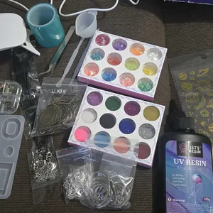 ·Great UV Resin Jewelry Kit: UV Resin Jewelry Kit includes high quality and high transparency clear UV resin 250g, Upgraded UV light, earring molds, 12 colors glitter, 12 colors glitter flakes, 12 kinds of decorations, bezel pendants, planet stickers, necklace chains, keyrings, earring hooks, jump rings, resin tape, tweezers, Epoxy resin tools (small silicone cup & stirring stick & silicone spoon), user manual.