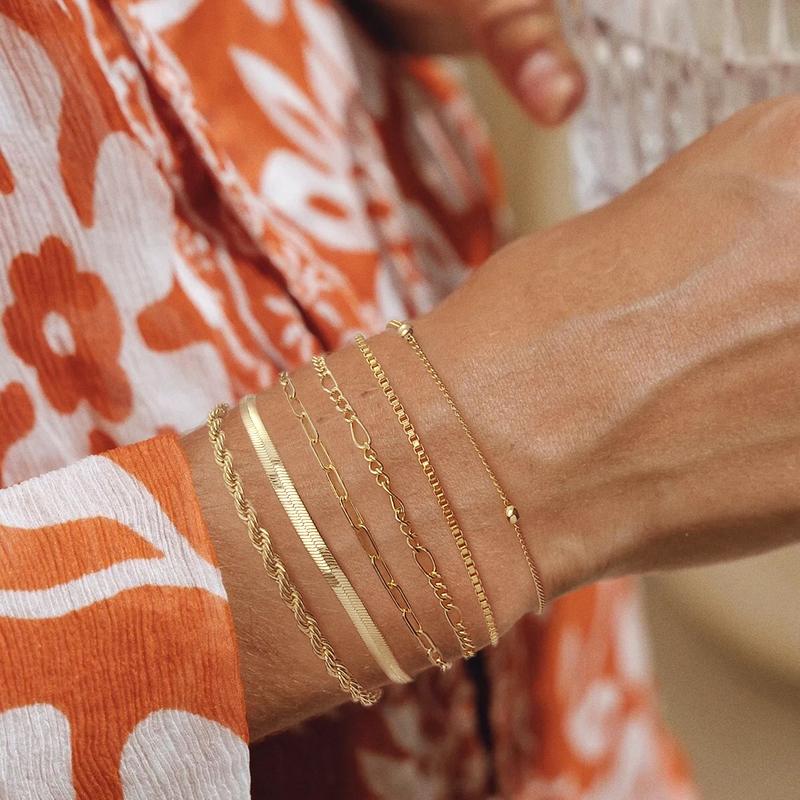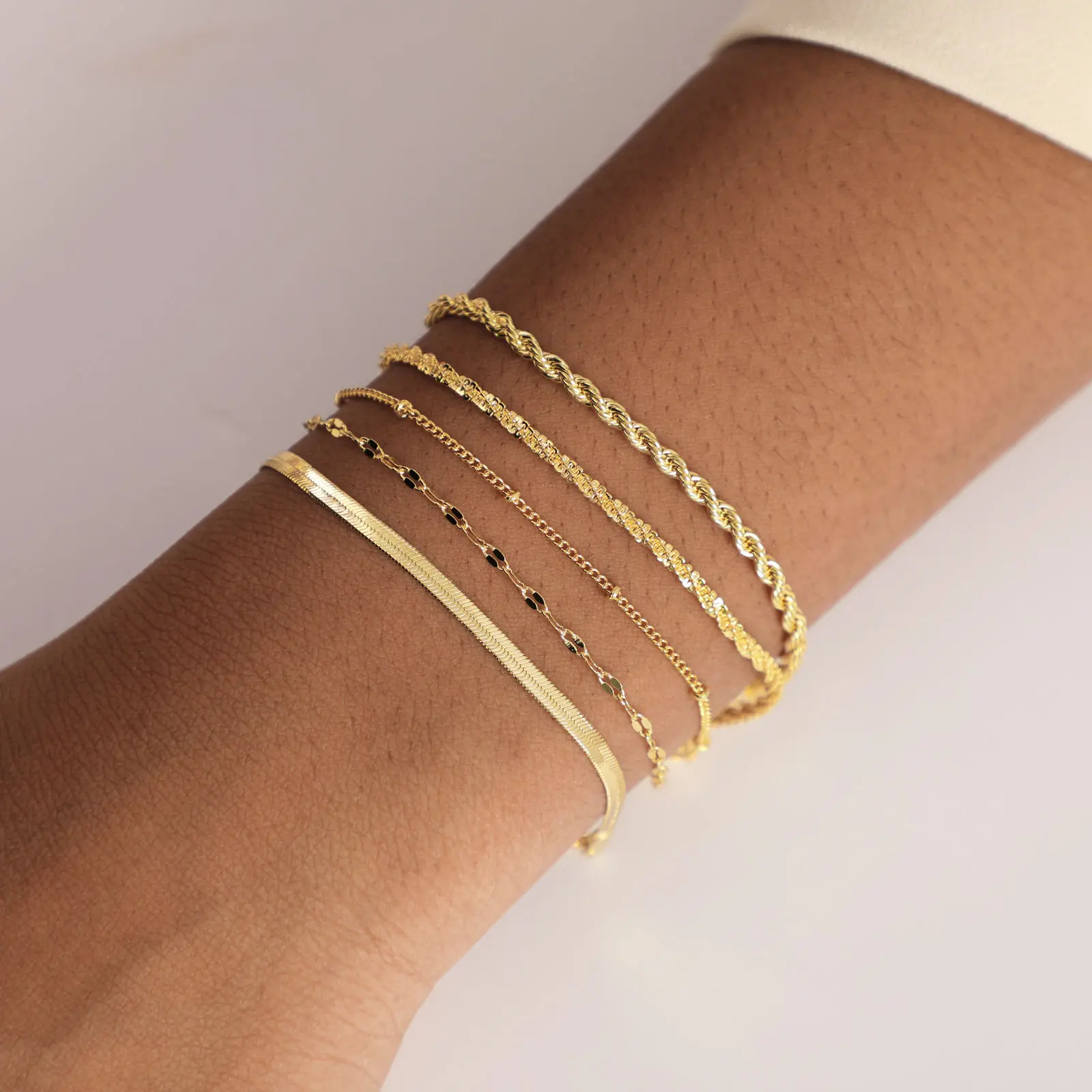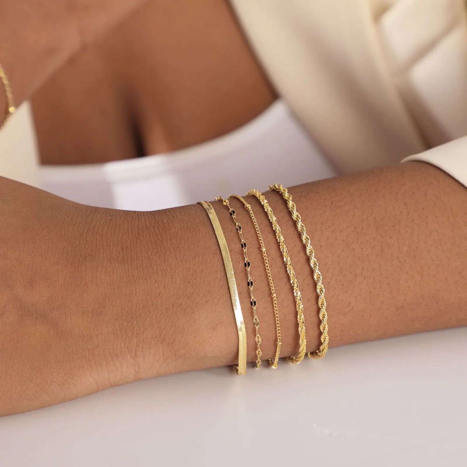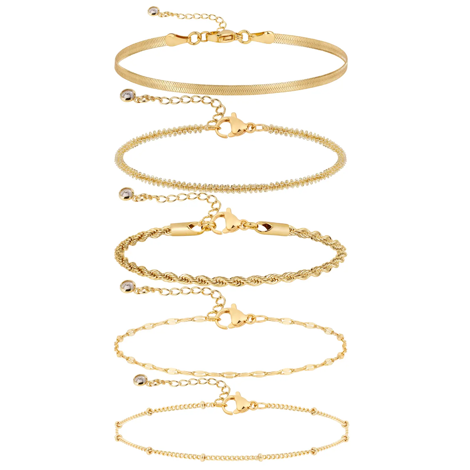 EXQUISITE DESIGN: The bracelet is available in five styles, including flat snake chain, beaded chain, paperclip chain, rope chain and more. Each design has its own characteristics. It can be worn alone, showing simplicity and elegance, or stacked, full of layers. The 14K gold-plated surface of the bracelet is dazzling, and you can set off your elegance with every gesture.