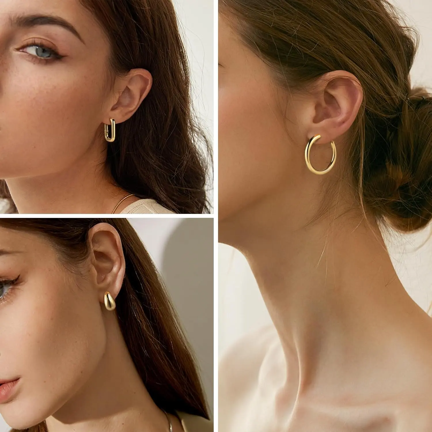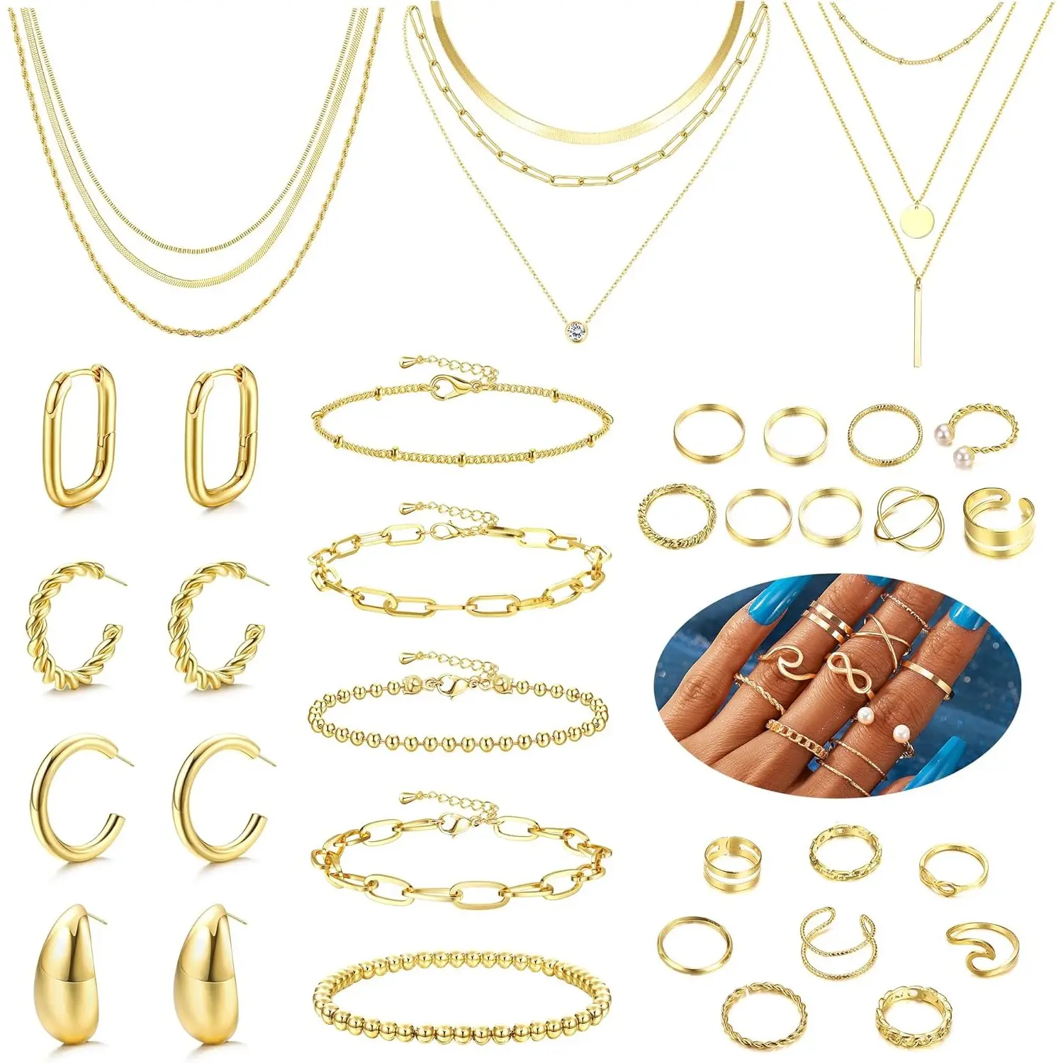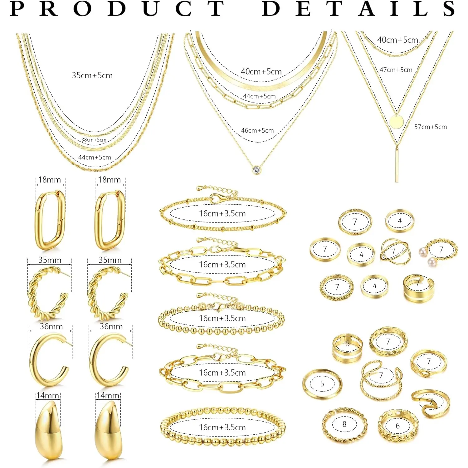 TRENDY JEWLERY: The jewelry pack have variety of trendy earrings, like square, twist, waterdrop gold hoop earrings; Classic bead and chain bracelets; timeless cross and band rings; 3 layered necklace. You can arbitrarily stack them to make your more charming.