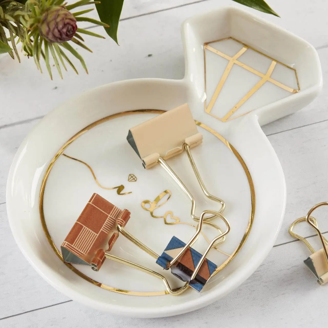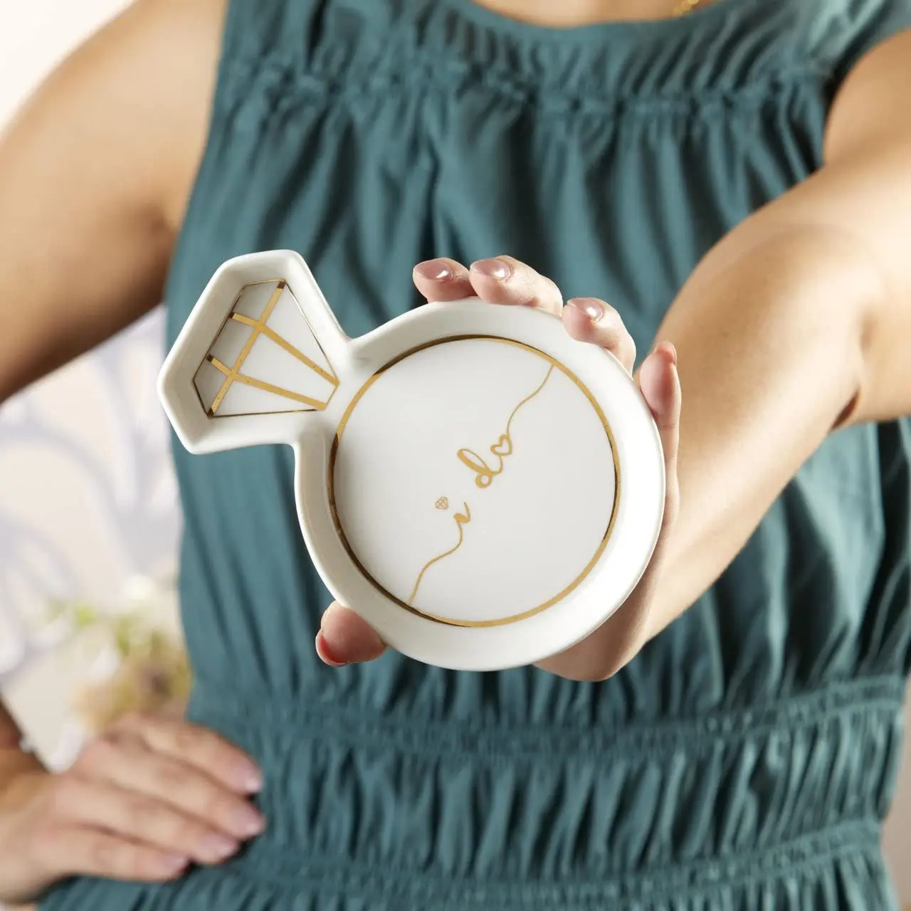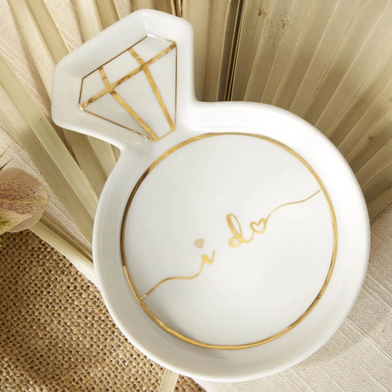 - The White Diamond Ring Trinket Dish is just what you need to keep those precious rings safe! The diamond ring shaped trinket dish is made of high quality ceramic and features a gold hand painted diamond ring with an "I do" saying against the white ceramic. The trinket dish can be used as a bridal party gift, bridal shower prize, or even for taking photos of the rings before walking down the aisle. Not just for rings, this thoughtful bridal party gift can be used to hold any piece of jewelry!
