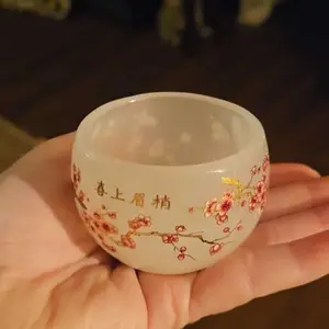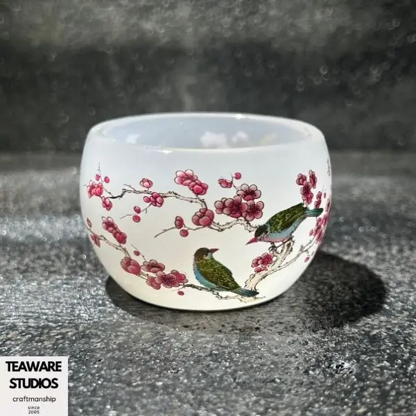Opaque White Agate - Like Jianzhan Teacup with Plum Blossom & Birds Pattern{Special link for live only}