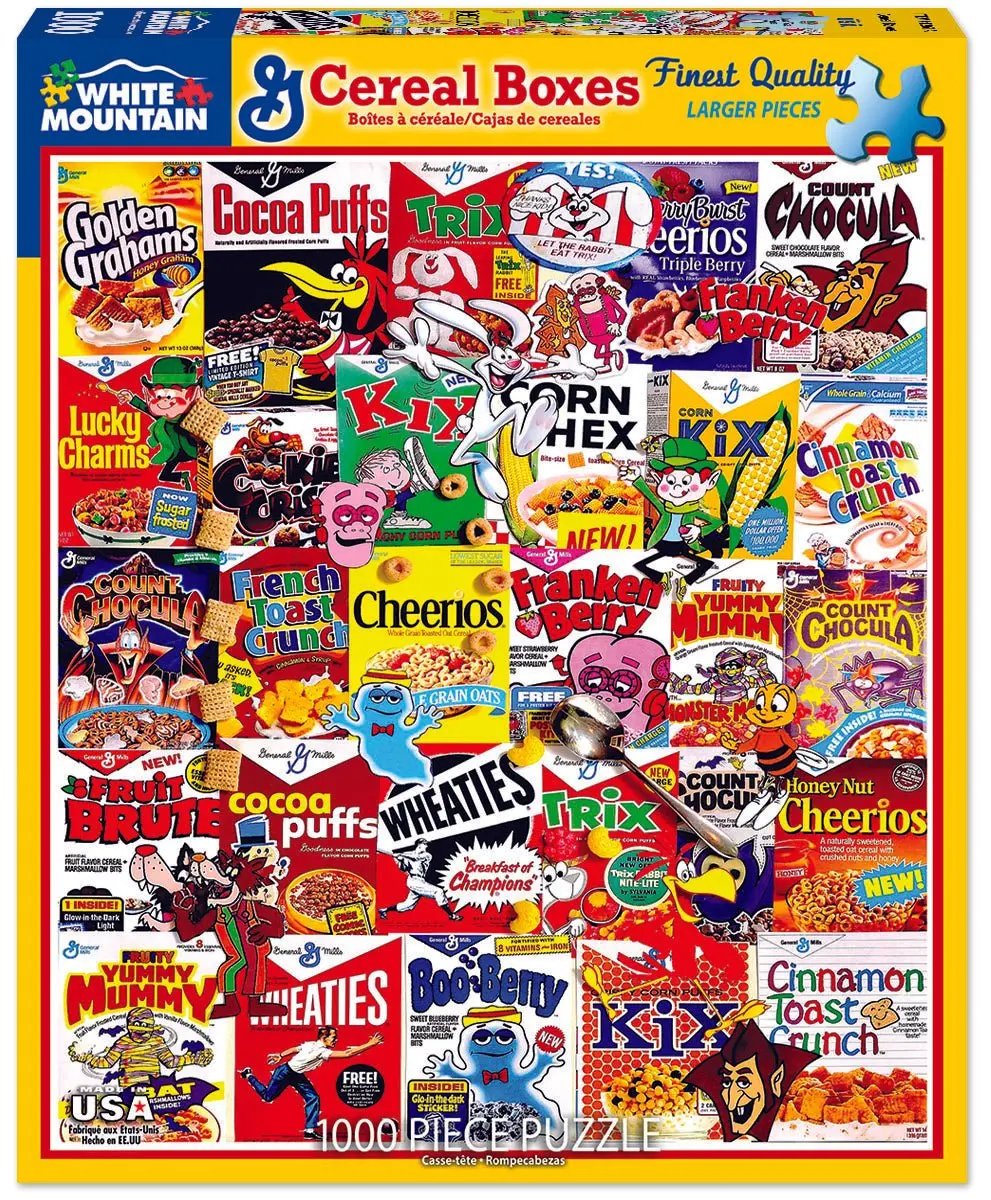 1261 Cereal Boxes. Here's our new and improved image of this super-popular puzzle with all new artwork from General Mills. Imagine yourself watching Saturday morning cartoons with a heaping bowl of Cocoa Puffs, Kix, or Lucky Charms. Perhaps you're a bit more mature and prefer Cheerios, Total, or Wheaties - but never forget, Silly Rabbit, Trix Are For Kids! 1,000 pieces with a finished size 24" x 30".