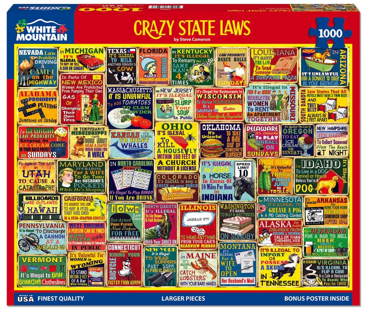1987 Crazy State Laws. Have you ever wondered what weird or outdated laws were still in effect. All the wondering is over. Designer Steve Cameron has complied a some of the strangest laws you never knew existed in this 1000 piece collage style jigsaw puzzle. Finished size 24" x 30".