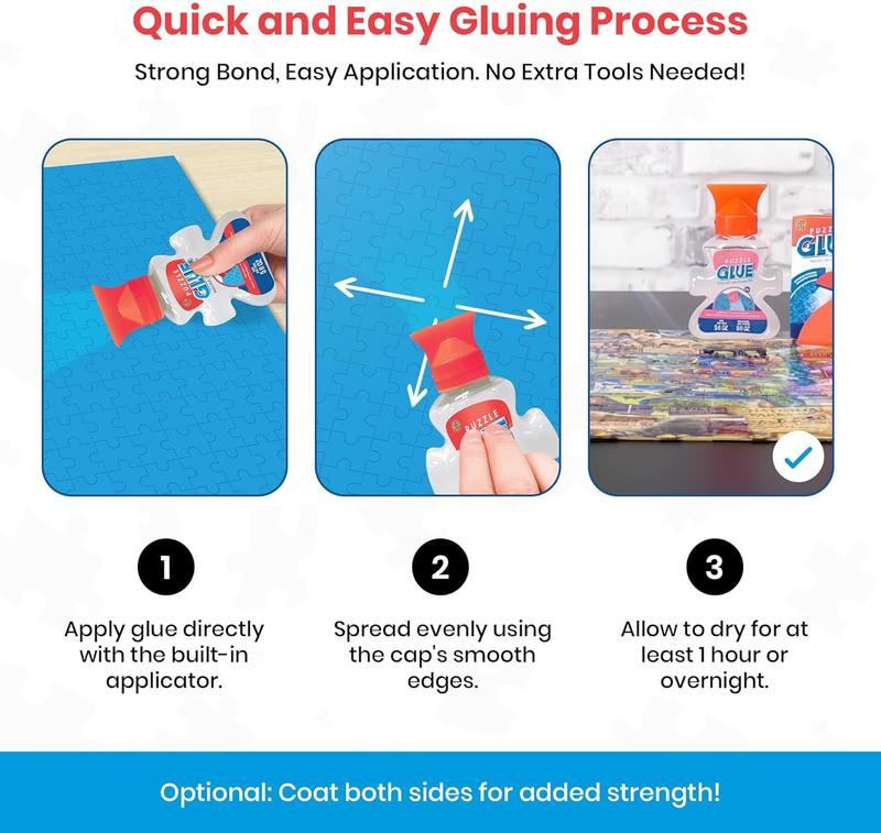 Crystal Clear Finish: The glue dries quickly, clearly, and cleanly, preserving the vibrant color and detail of your puzzle without any unsightly residue.