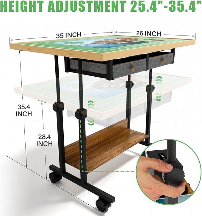 ·【Adjustable Height and Angle】Our puzzle table lets you enjoy puzzling comfortably. You can easily adjust the height of the table (from 28.4 to 35.4 inches) to suit different seats and heights. This is especially helpful for older people who need to elevate their knees or feet. You can also tilt the tabletop to 5 different angles (from 0°to 35°), helping you avoid neck and back discomfort caused by bending your head to do puzzles