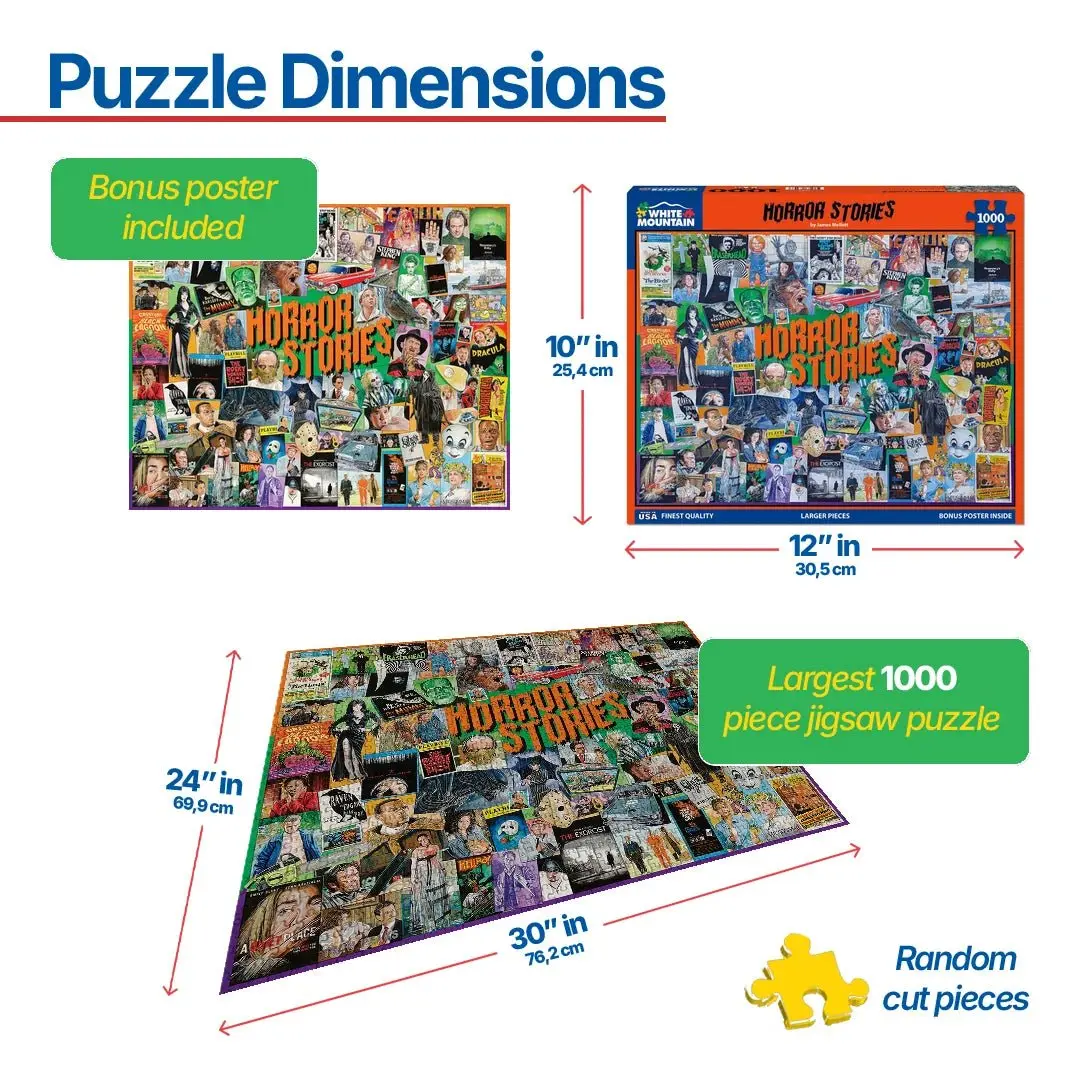 Calling all horror lovers! The Horror Stories 1000-piece puzzle from White Mountain Puzzles is a chilling masterpiece. Featuring iconic horror scenes and legendary monsters, this high-quality puzzle boasts thick, durable pieces that fit together seamlessly. Whether you’re a casual puzzler or a die-hard horror fan, this eerie and intricate design will keep you entertained for hours. Perfect for spooky season… or any time you want a little thrill! Would you dare to complete it? #HorrorPuzzle #WhiteMountainPuzzles #SpookySeason #PuzzleLover #HorrorFan #ThrillSeeker #MindGames #PuzzlingFun #ClassicHorror #1000PiecePuzzle @White Mountain Puzzles