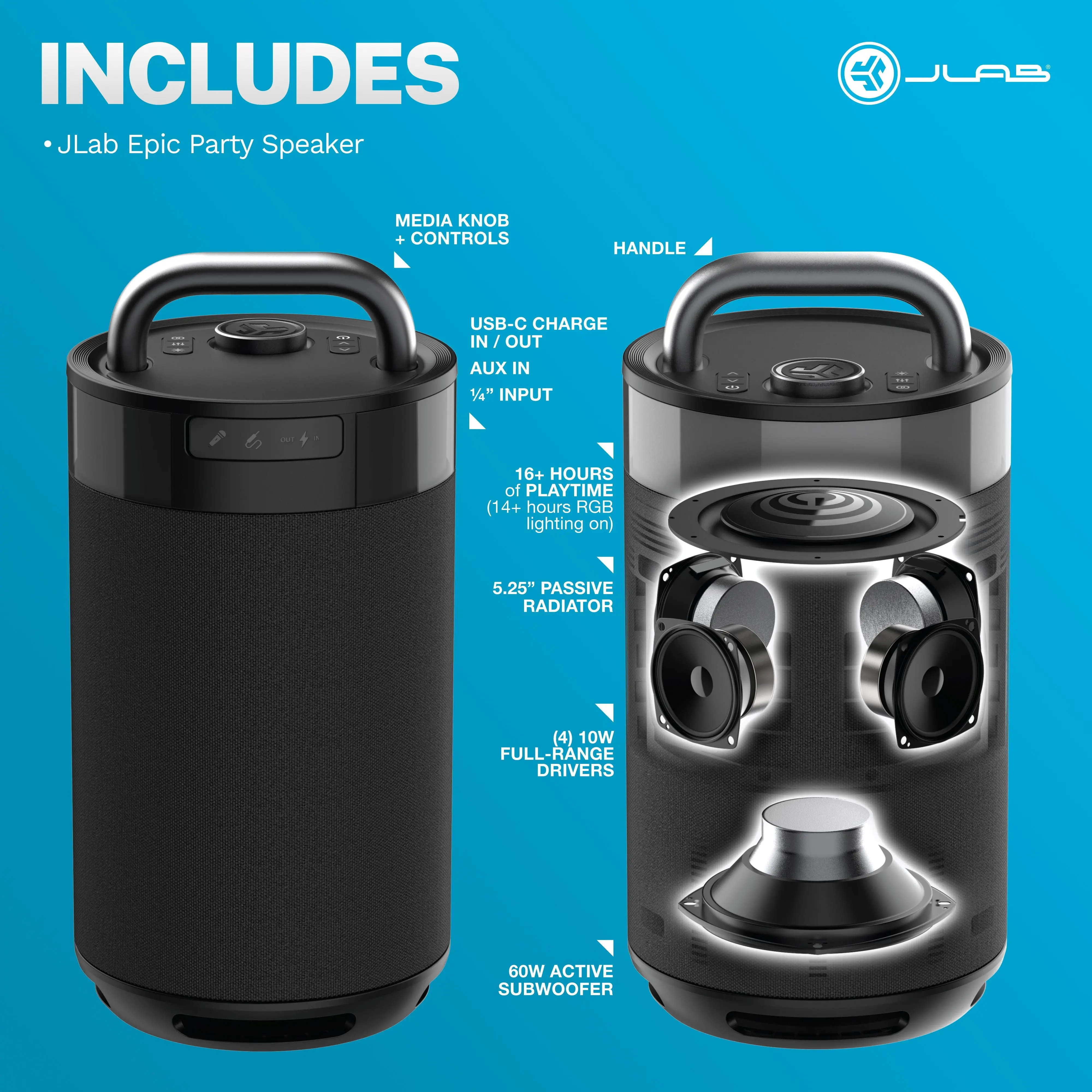 Customize your EQ settings and RGB lighting with the JLab App, or take control using the built-in JLab Media Knob. Whether you’re throwing a party, watching a movie, or chilling outdoors, this system brings Lab Quality Sound and vibrant lighting that syncs to your vibe.