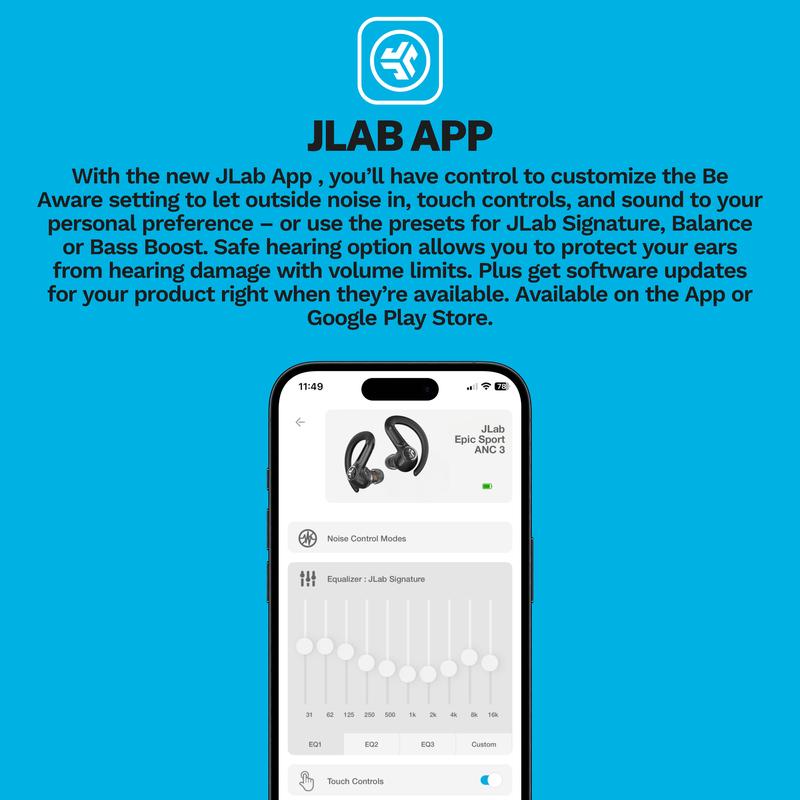 JLab App: With the new JLab App , youâll have control to customize the Be Aware setting to let outside noise in, touch controls, and sound to your personal preference â or use the presets for JLab Signature, Balance or Bass Boost. Safe hearing option allows you to protect your ears from hearing damage with volume limits. Plus get software updates for your product right when theyâre available.