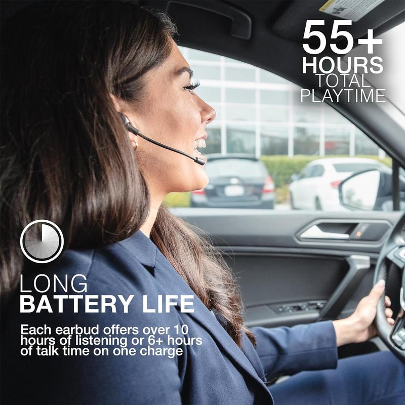 LONG BATTERY LIFE: The Work Buds True Wireless headset boasts a long 55+ total hours playtime. Enjoy your music, podcasts, or take calls for extended periods without having to worry about running out of battery. The earbuds themselves have a playtime of 10+ hours per single charge for listening or 6+ hours of talk time. With its charging dock, you can easily top up the earbuds' battery whenever needed, ensuring that you never run out of juice when you need it most.