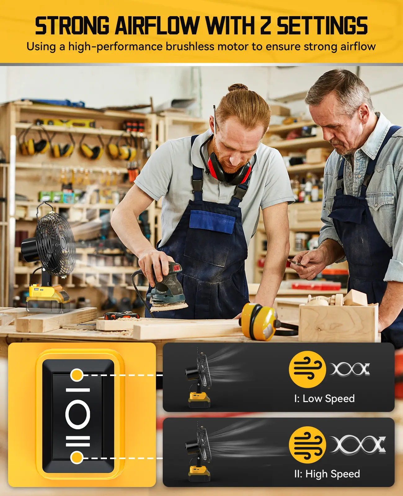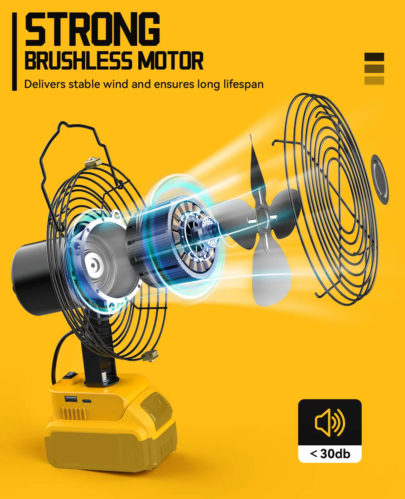The head of portable brushless fan with 70-170 degree rotating allows you to get airflow from different directions. Outdoor fan can be used in darkness jobsite work area, sleeping, construction site, camping, repairing, barbecue for power failure etc.