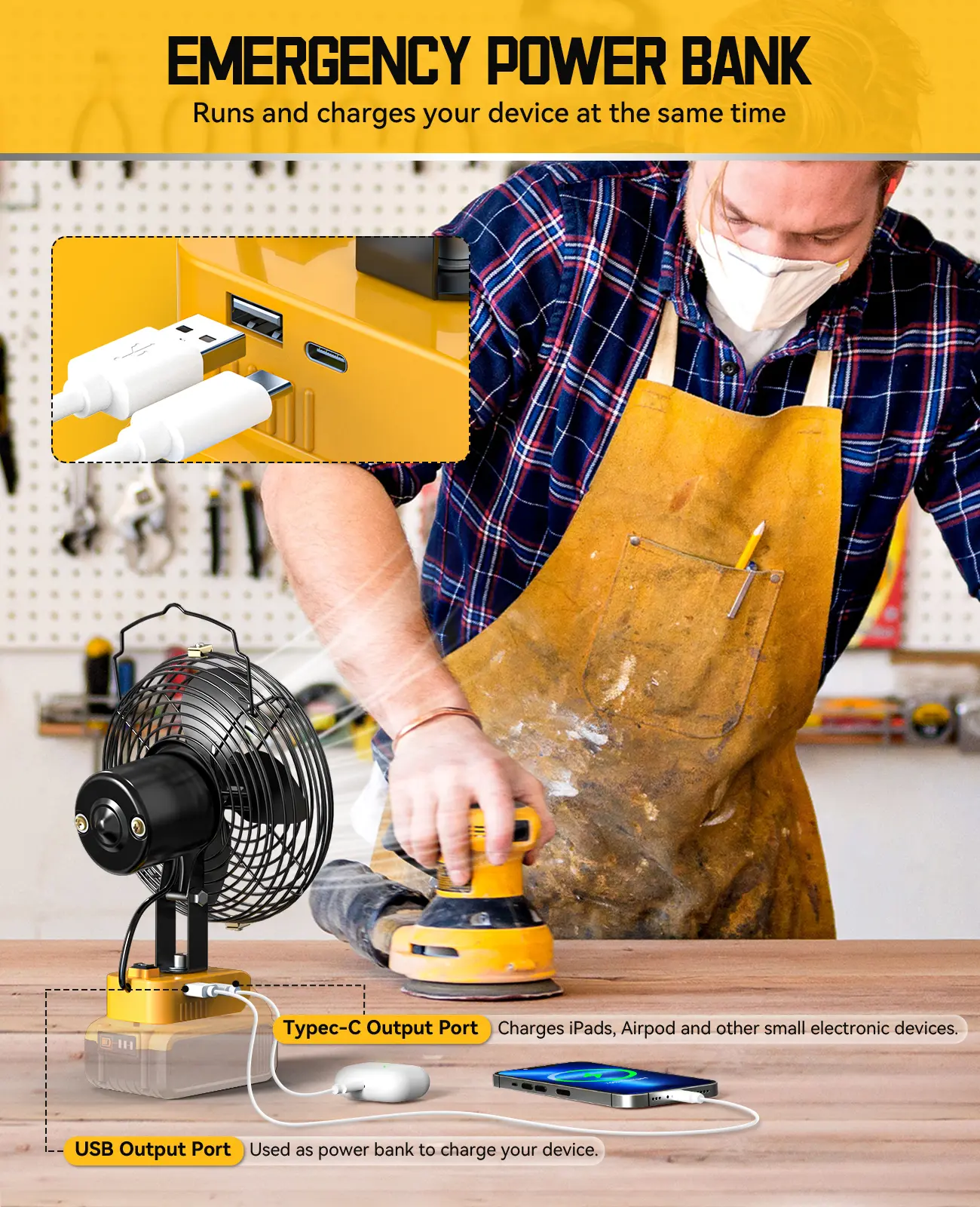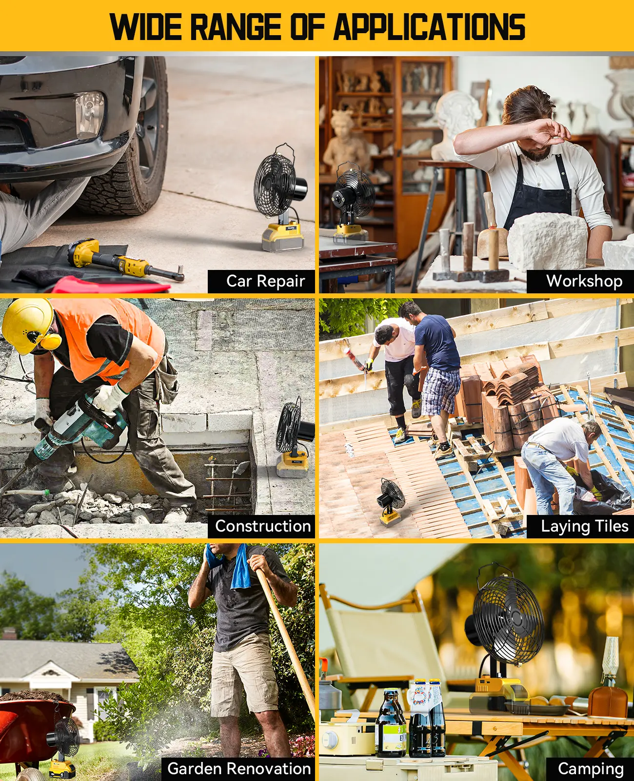 Cordless jobsite fan for dewalt 20v lithium-ion batteries DCB206 DCB205 DCB204 DCB181 DCB182 DCB200 DCB203 DCB205-2 DCB204-2 DCB206-2 and more. Easy to use even when there is no power supply outdoors, as long as you bring batteries. Making it easy to work in tight spaces, on job sites, or outdoors. Warm tip: this product does not include batteries.