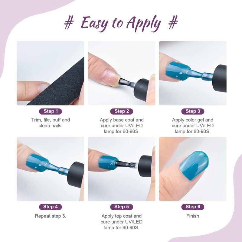 Health Ingredients: Gel nail polish is made of natural resin, health substance and professional formula. The texture is silky, which can be easily smeared; The brush is soft and can be applied in all directions. It is very friendly to novices and professional manicurists. Please use them with confidence.